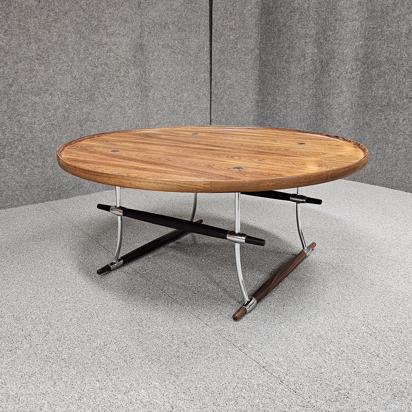 Stokkebord ligeledes med stel i palisander og forkromet stål og med bordplade af palisander.