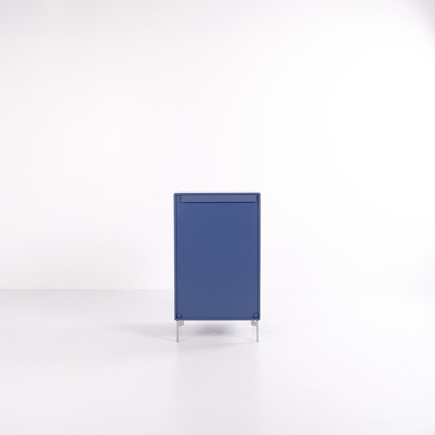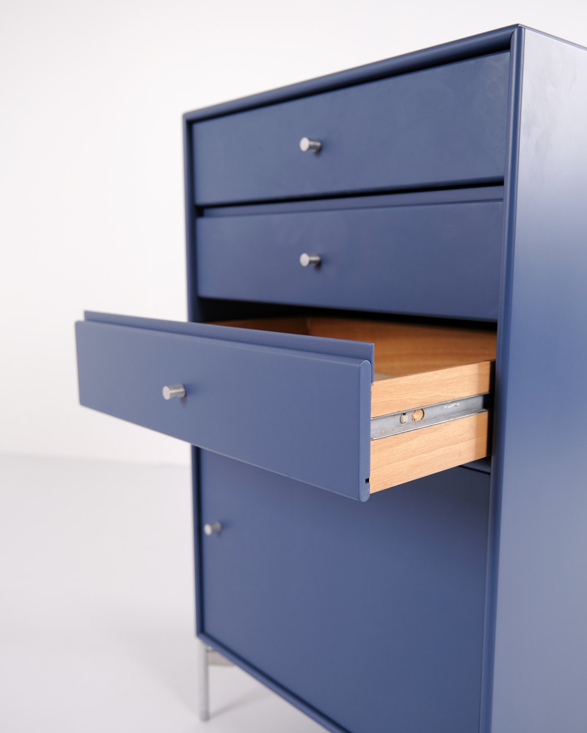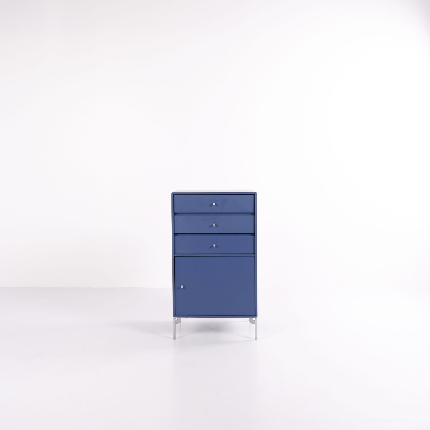 Montana cabinet / filing cabinet in blue, fitted with chrome legs. Features three drawers and one door, ideal for storage in an office, living room or hallway. Classic Montana module with high functionality and timeless design.