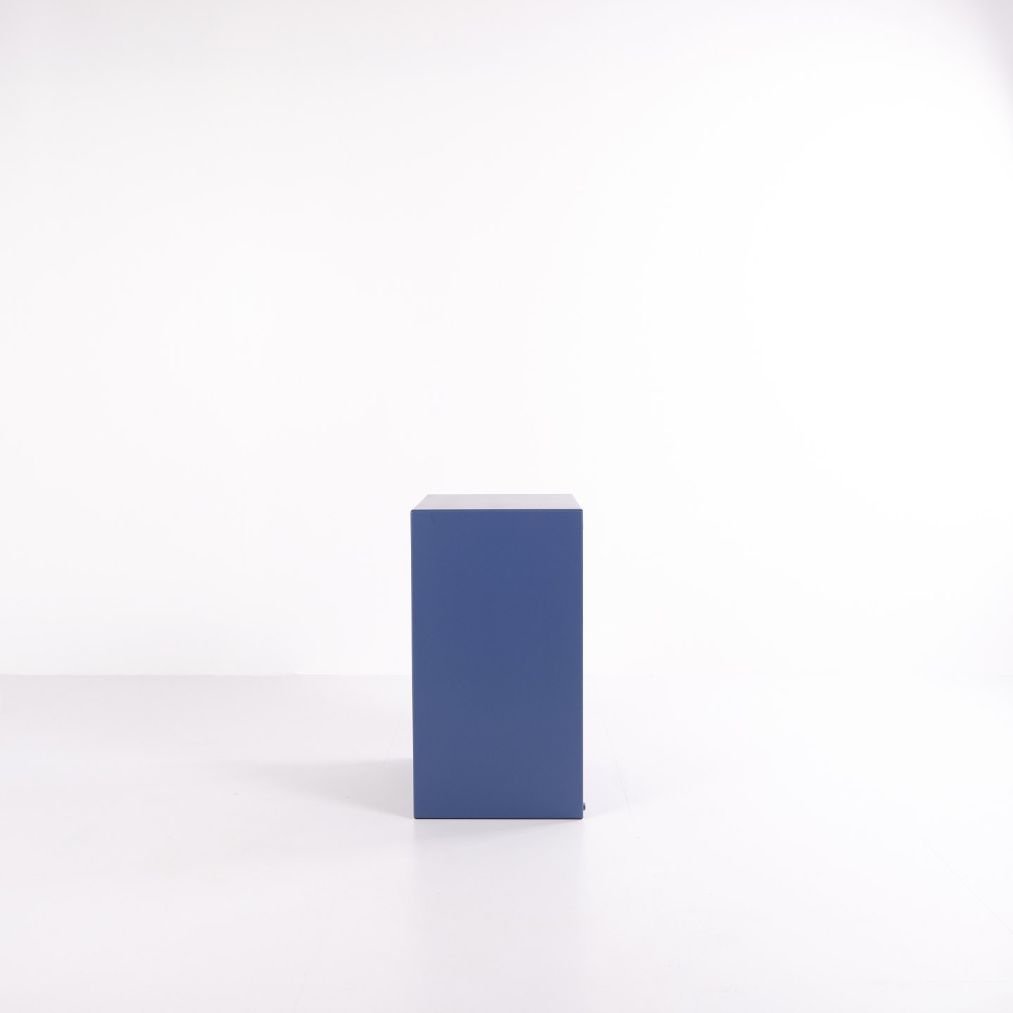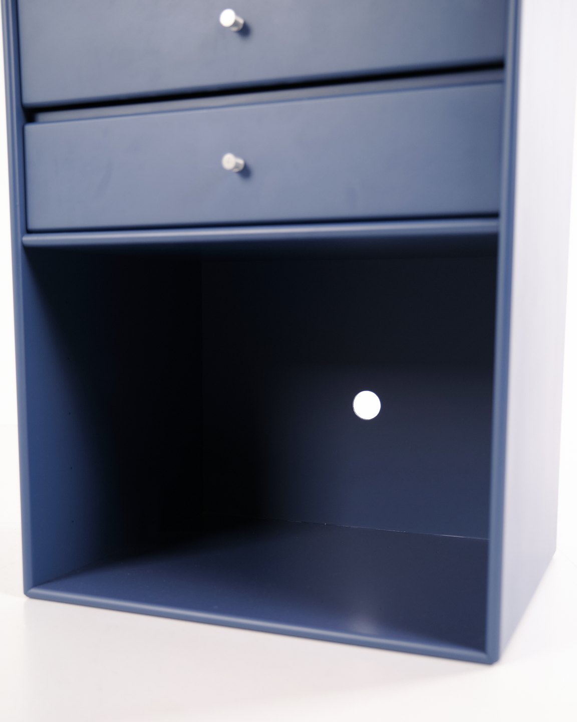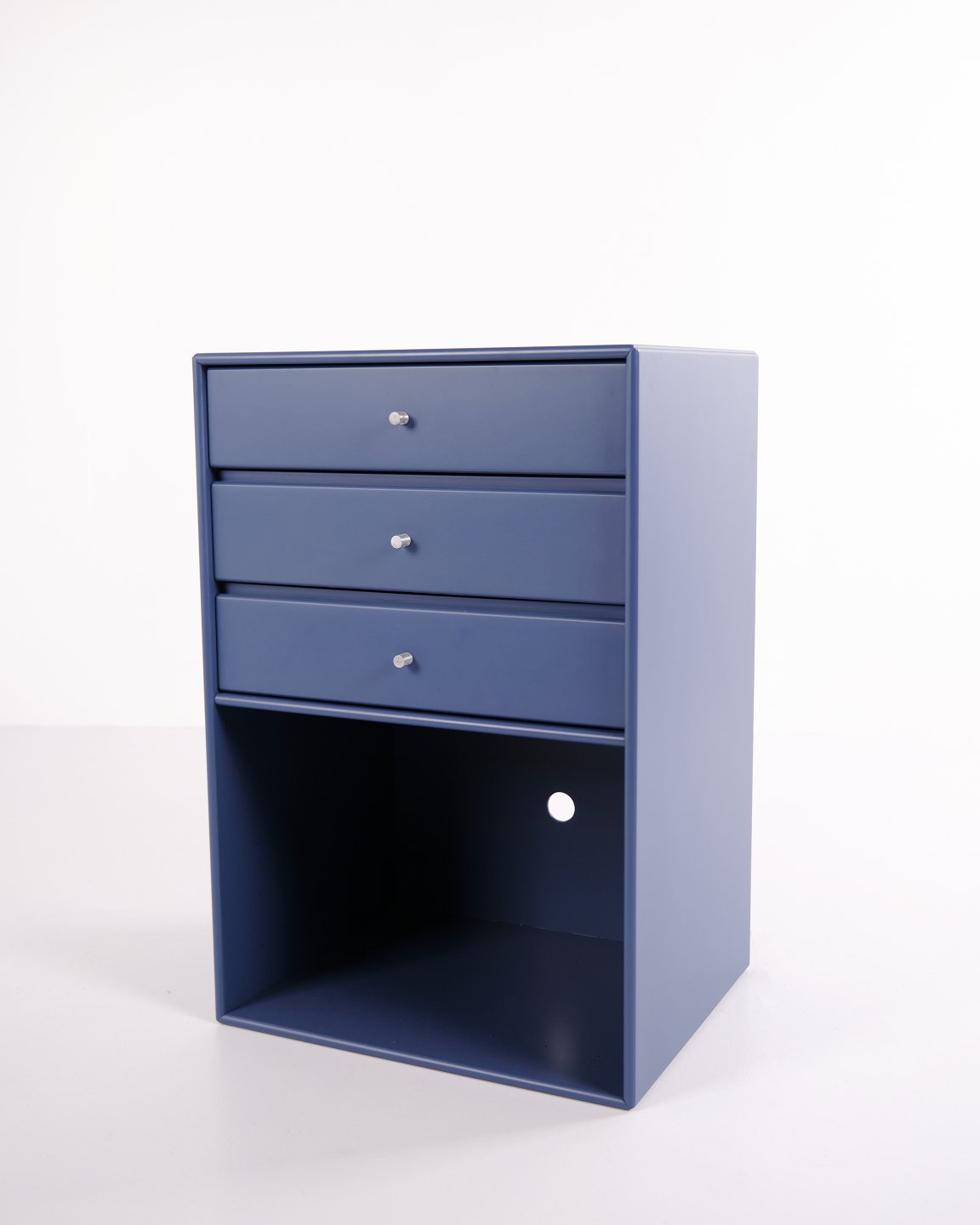 Montana shelf unit in blue with chrome legs. Designed with three drawers and one open shelf, suitable for both storage and display. A classic Montana module combining functionality with a clean, simple design.