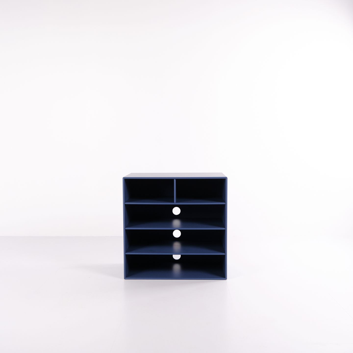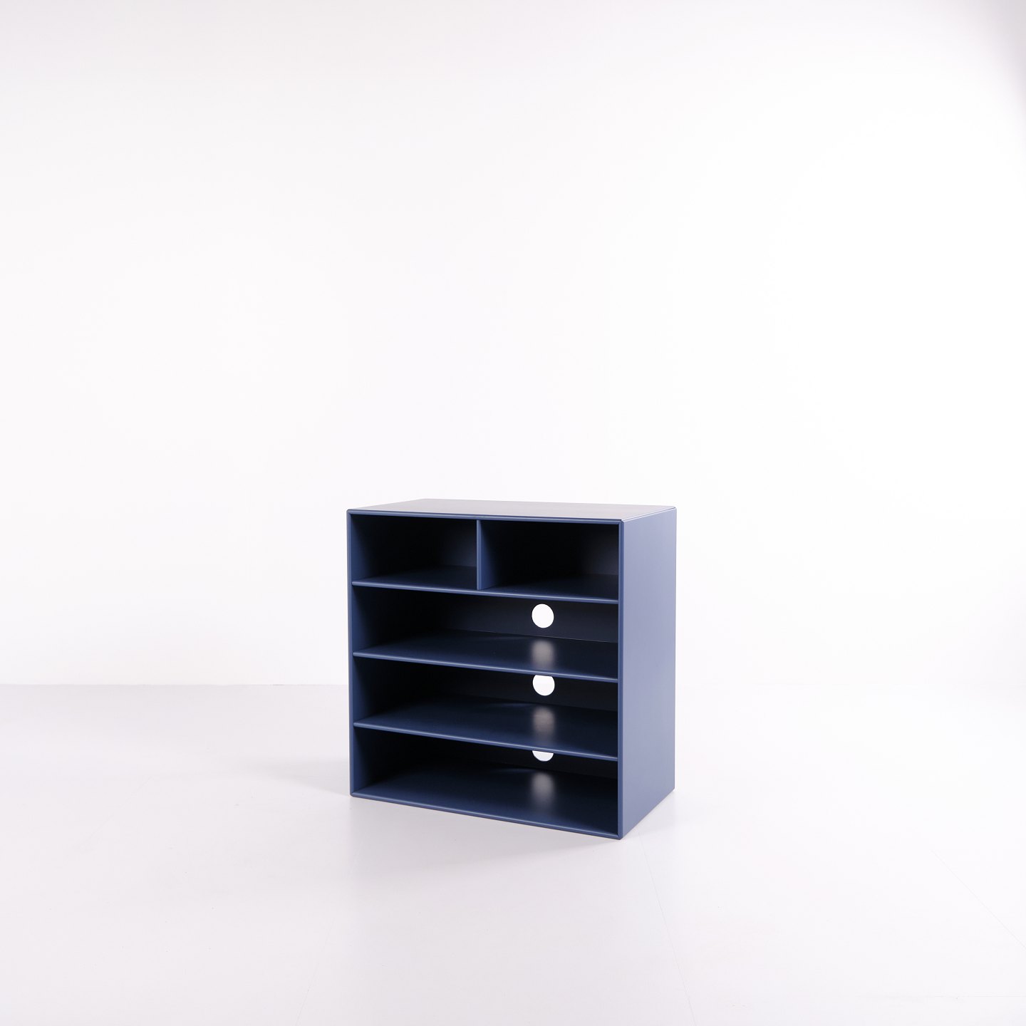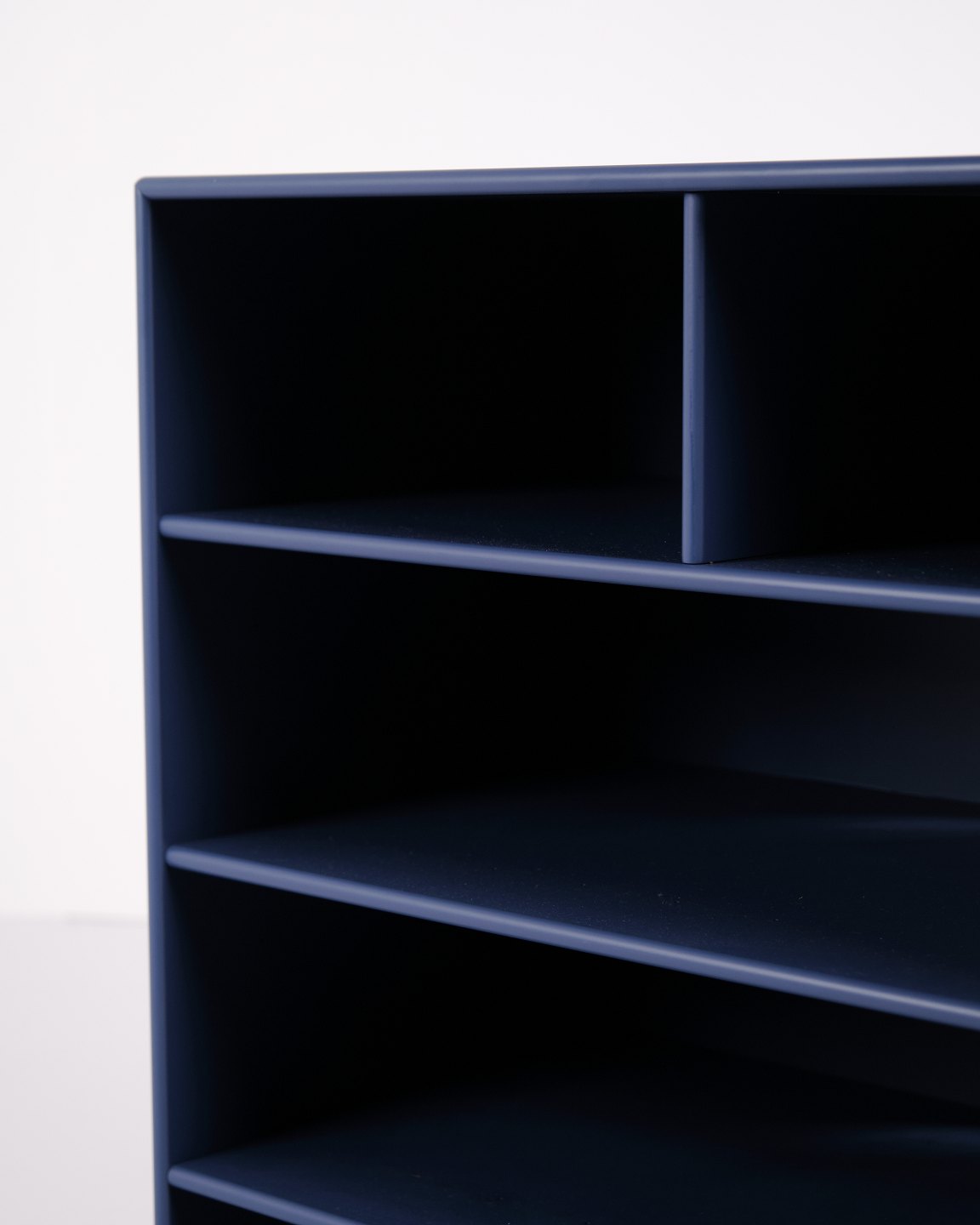 Montana shelf unit in blue with chrome legs. Designed with four open shelves, ideal for storage or display in a living room, office or hallway. A classic Montana module with simple structure and high functionality.