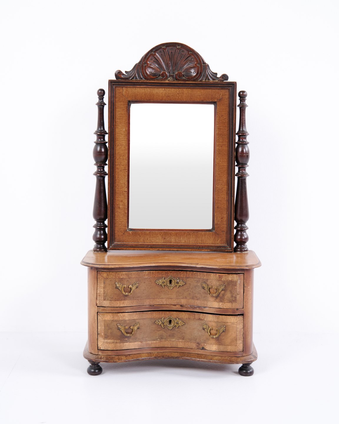 Small piece of children’s furniture from around 1860, made in mahogany with mirror and two drawers. A decorative and rare antique item with fine details, suitable for collectors or classic interiors.