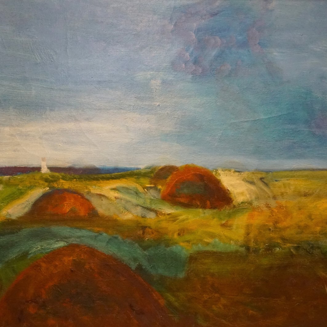 Jens Søndergaard; Landscape painting with fields in the foreground, and tower and sea in the background. Oil on canvas.