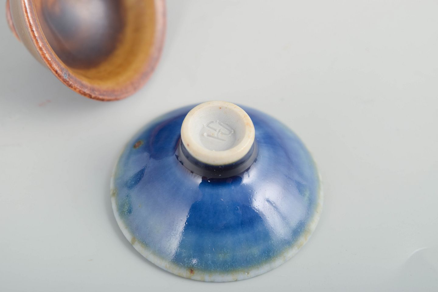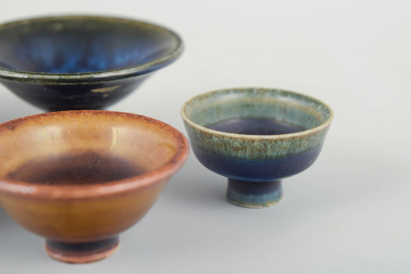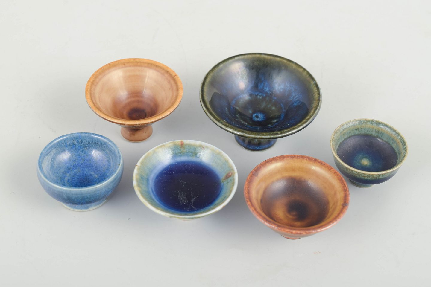 A decorative set of six hand-thrown miniature stoneware bowls, each with its own form and glaze character in blue, green and brown tones. A charming example of small-scale Swedish studio ceramics.