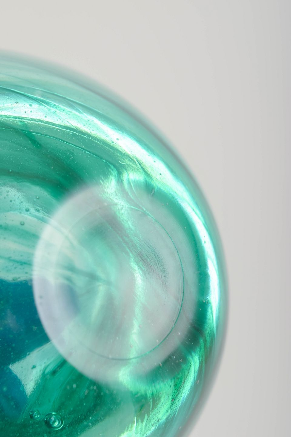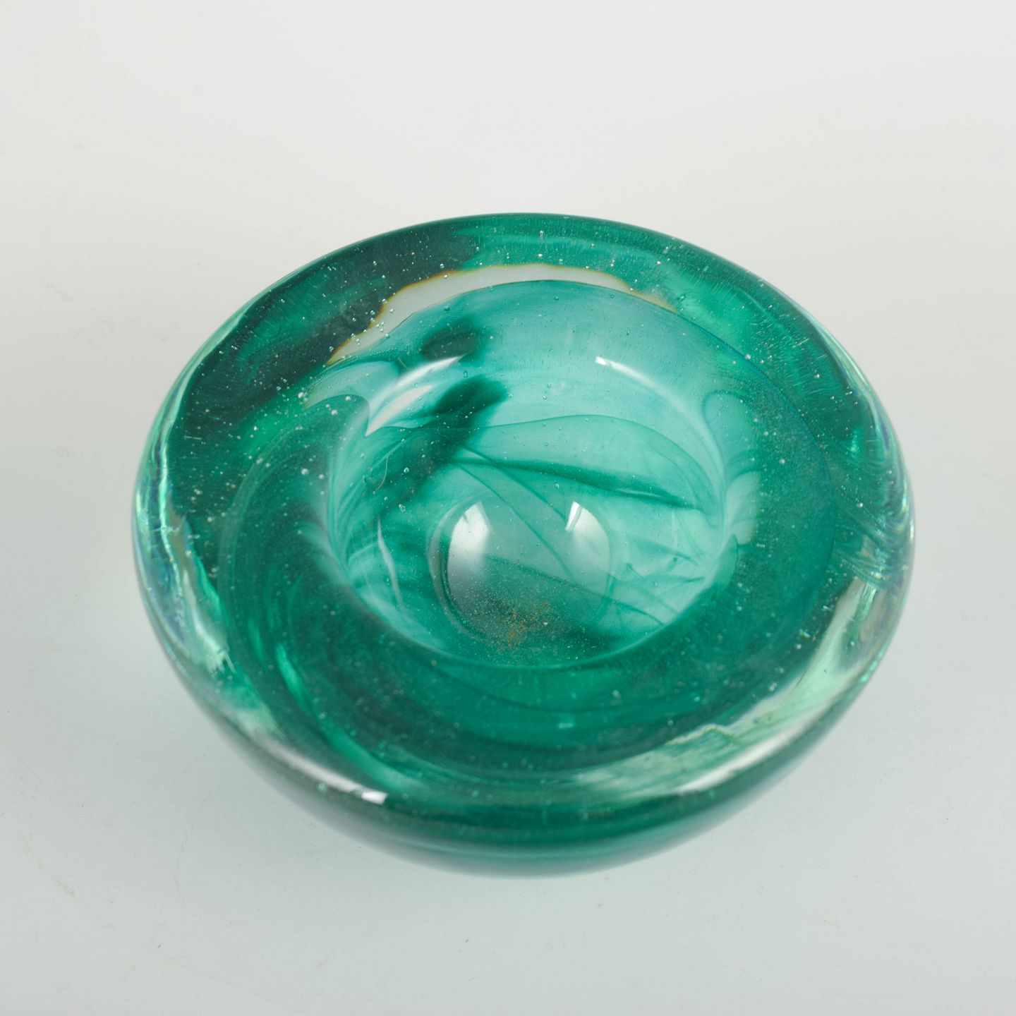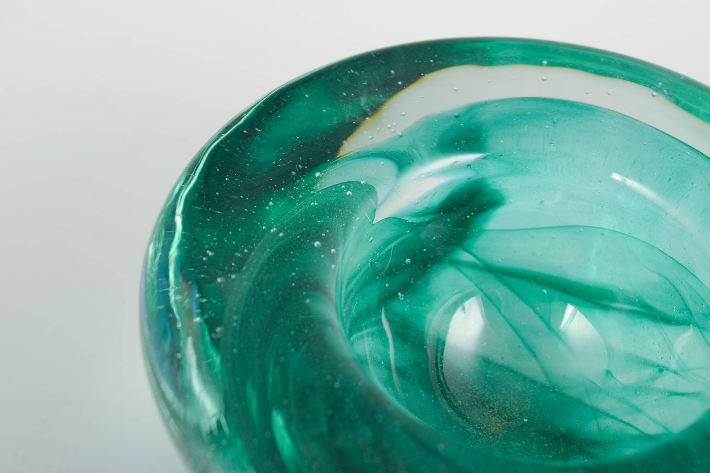 Organically shaped bowl in mouth-blown glass with layered color play in clear green and transparent tones, typical of Scandinavian art glass from the period.