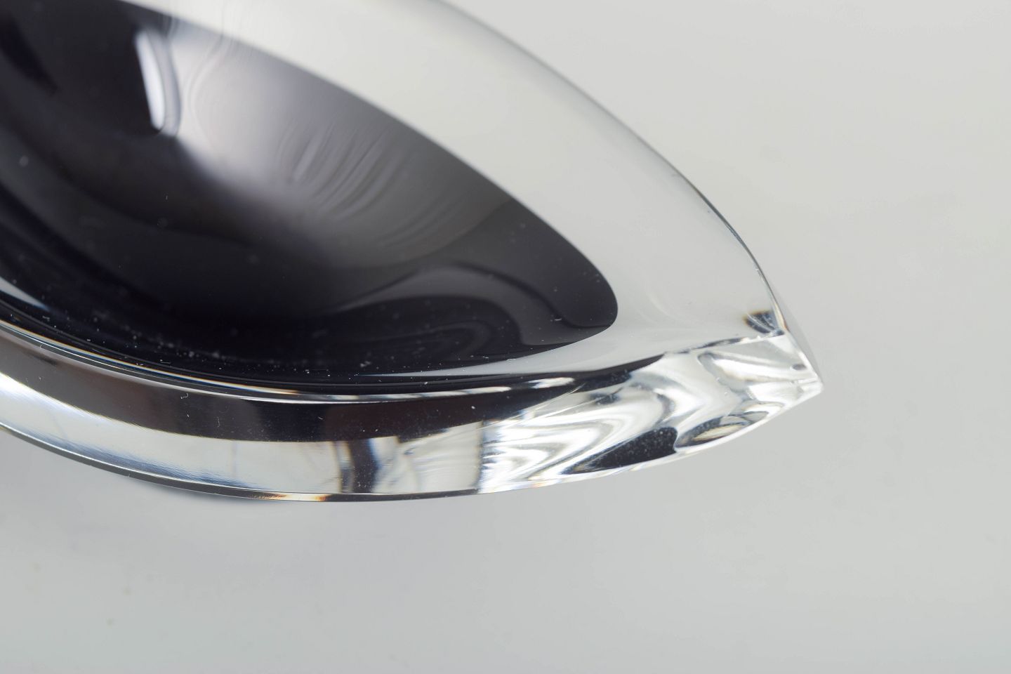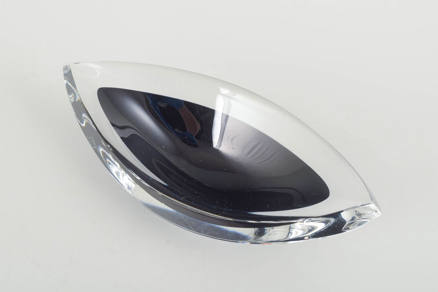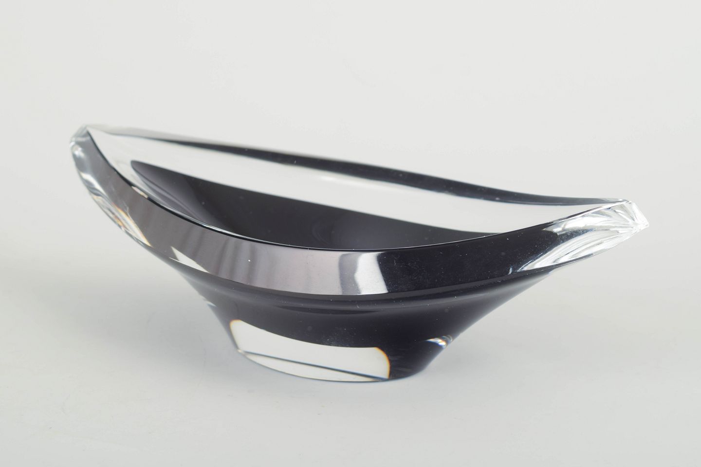 Mouth-blown bowl in clear and black glass with an elegant boat-shaped silhouette and polished surfaces creating beautiful light reflections.