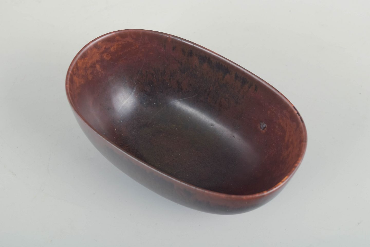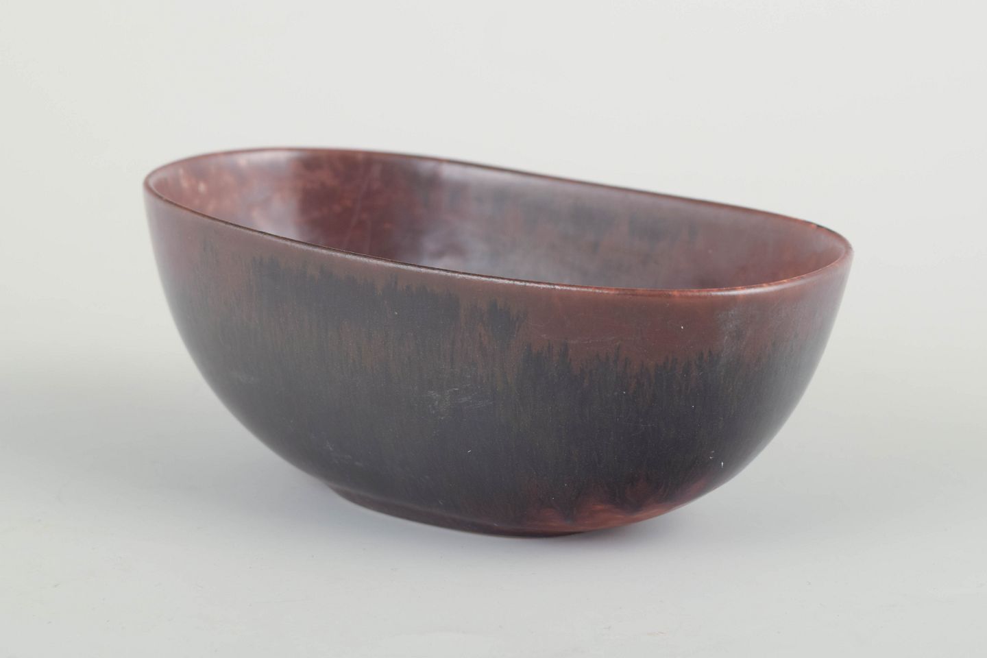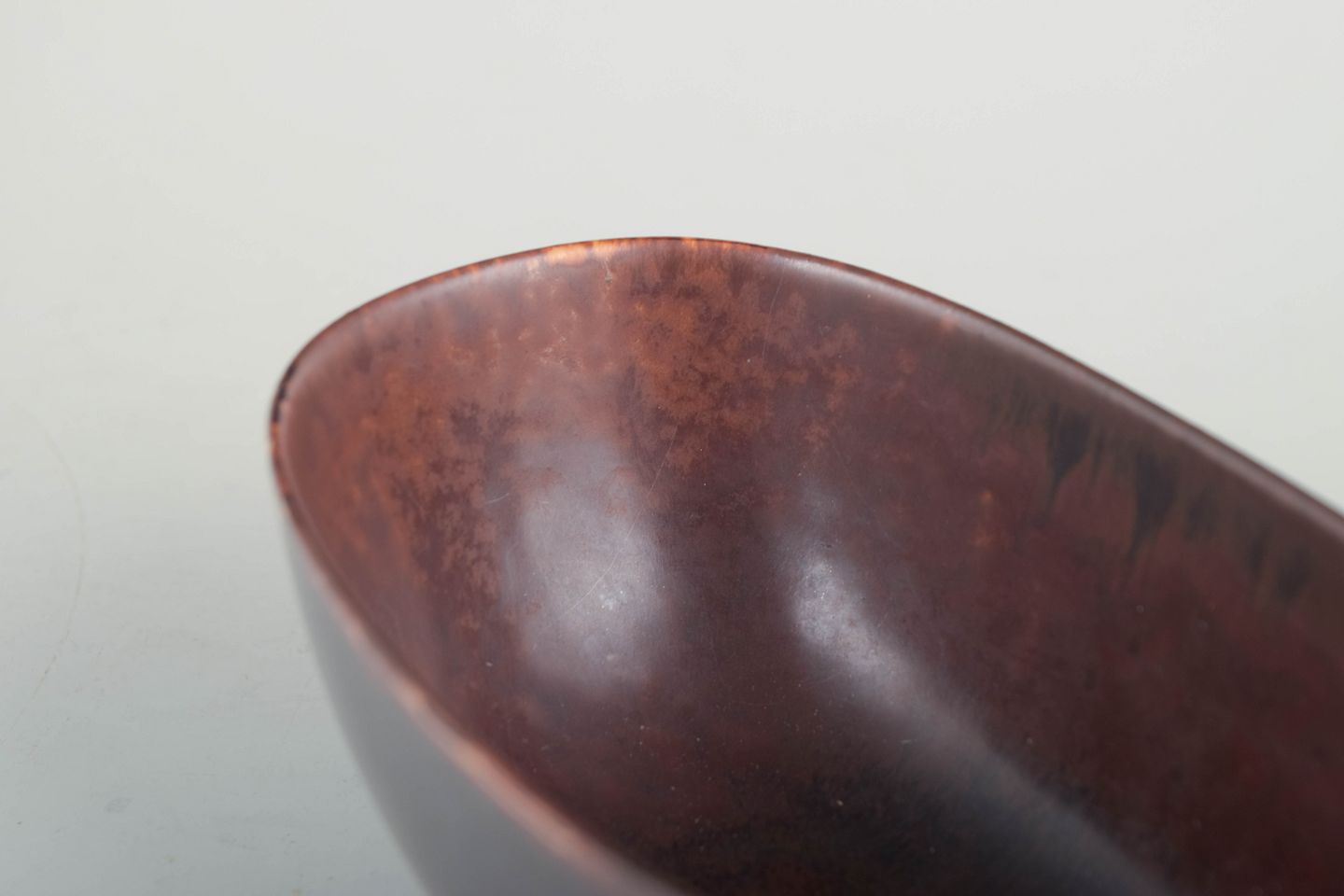 Oval stoneware bowl with low foot and reddish-brown glaze with darker flowing tones – an example of Stålhane’s elegant, restrained design language and refined glaze work. Marked as 2nd quality.