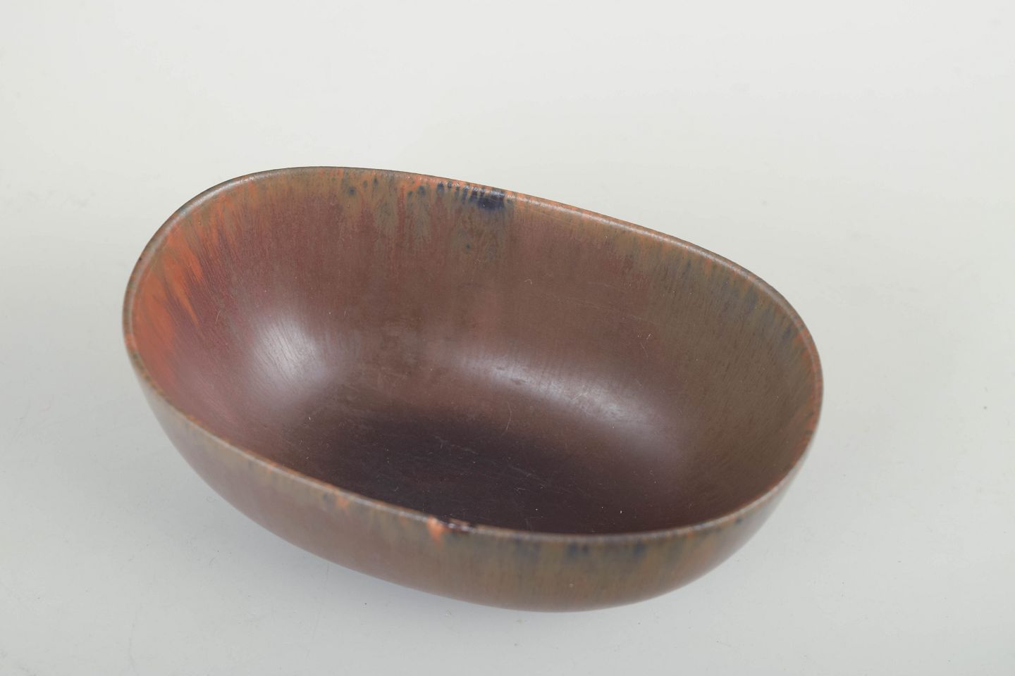 Oval stoneware bowl with low foot and reddish-brown glaze with darker flowing tones – an example of Stålhane’s elegant, restrained design language and refined glaze work. Marked as 2nd quality.