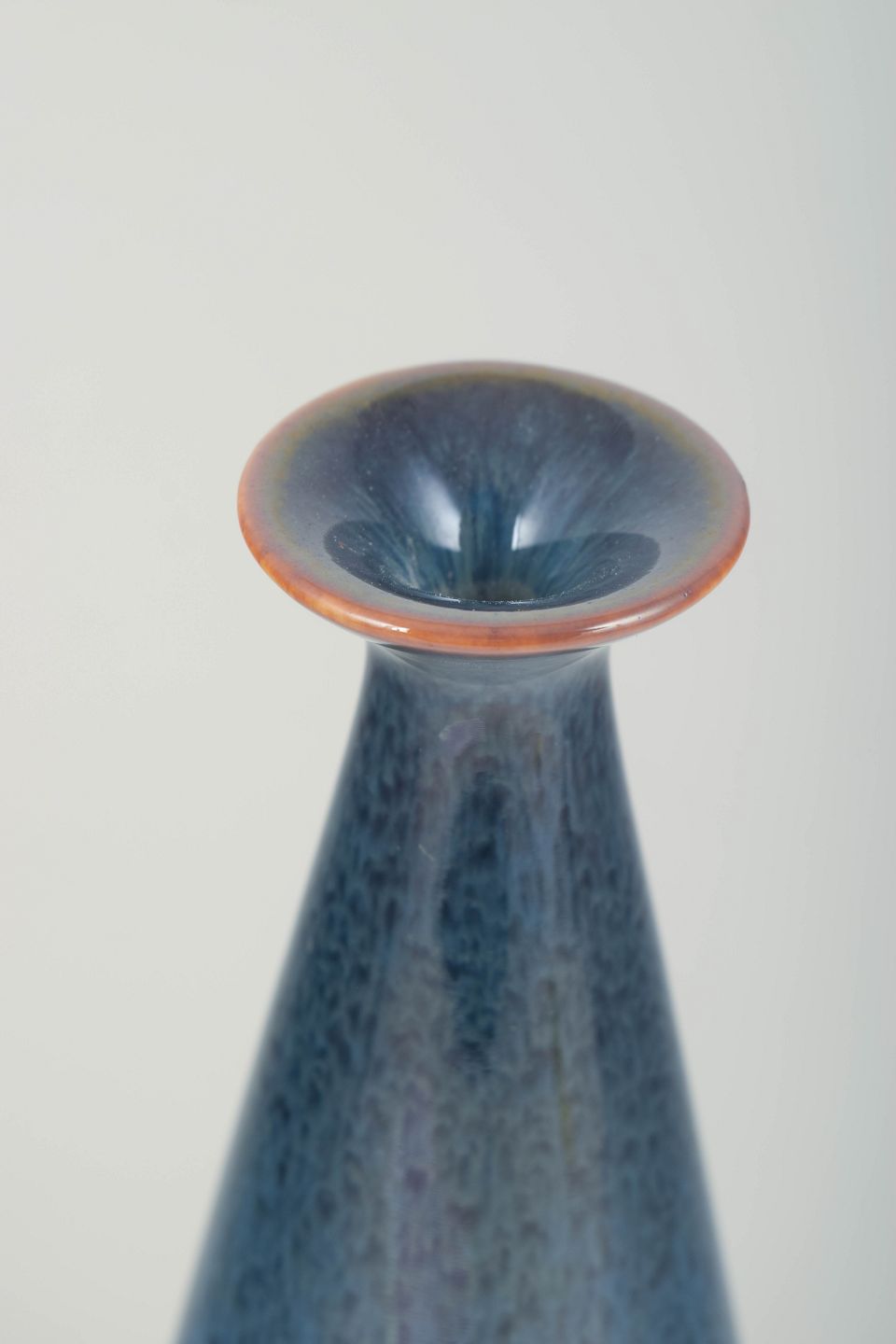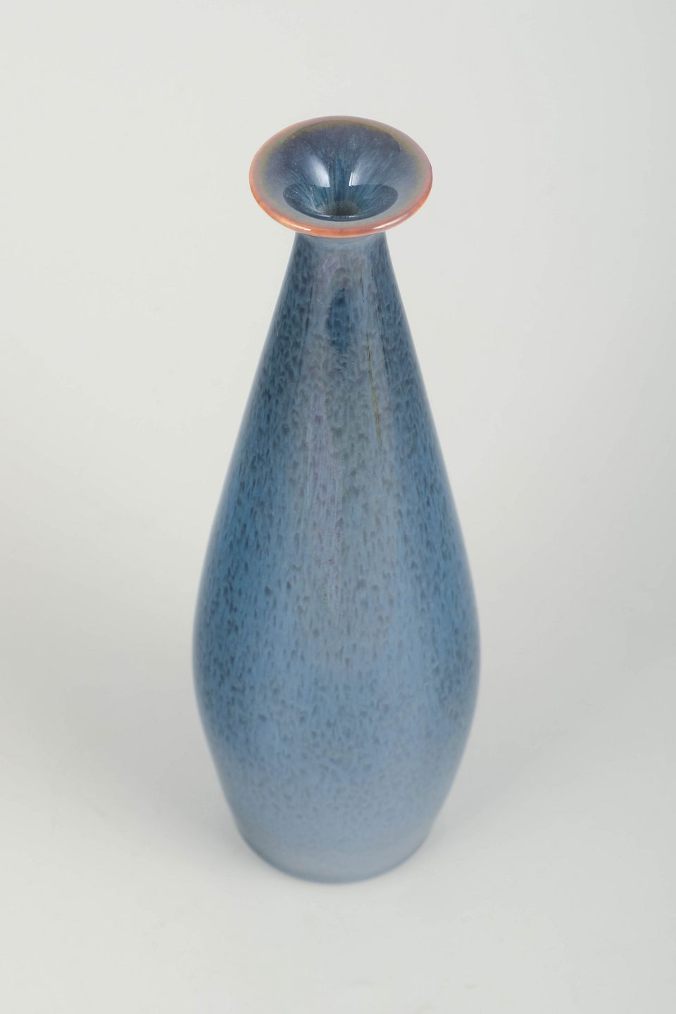Elegant drop-shaped stoneware vase with a narrow neck and flared rim, featuring a beautiful blue glaze with nuanced speckled texture and a subtle reddish edge at the top – a characteristic example of Stålhane’s refined form language and glaze mastery.