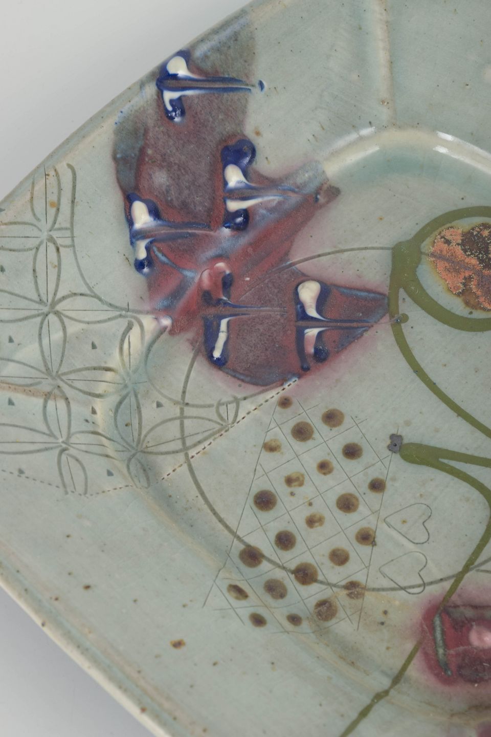 Unique square dish in Chinese-inspired style with decorative relief and brush-painted motifs, featuring a light celadon-style glaze with coloured accents. Signed.