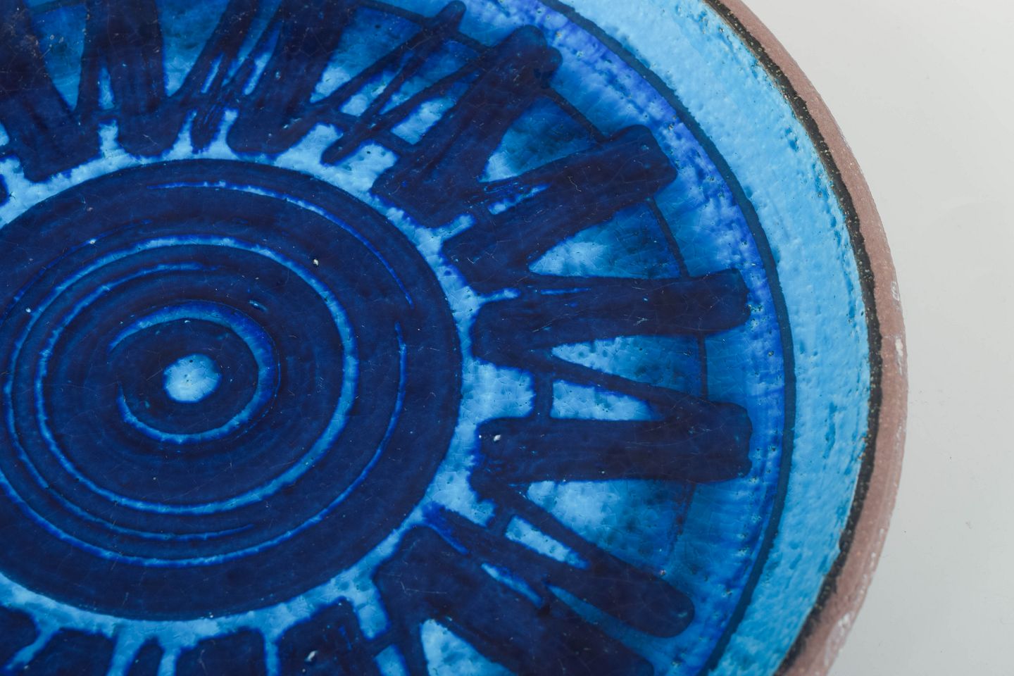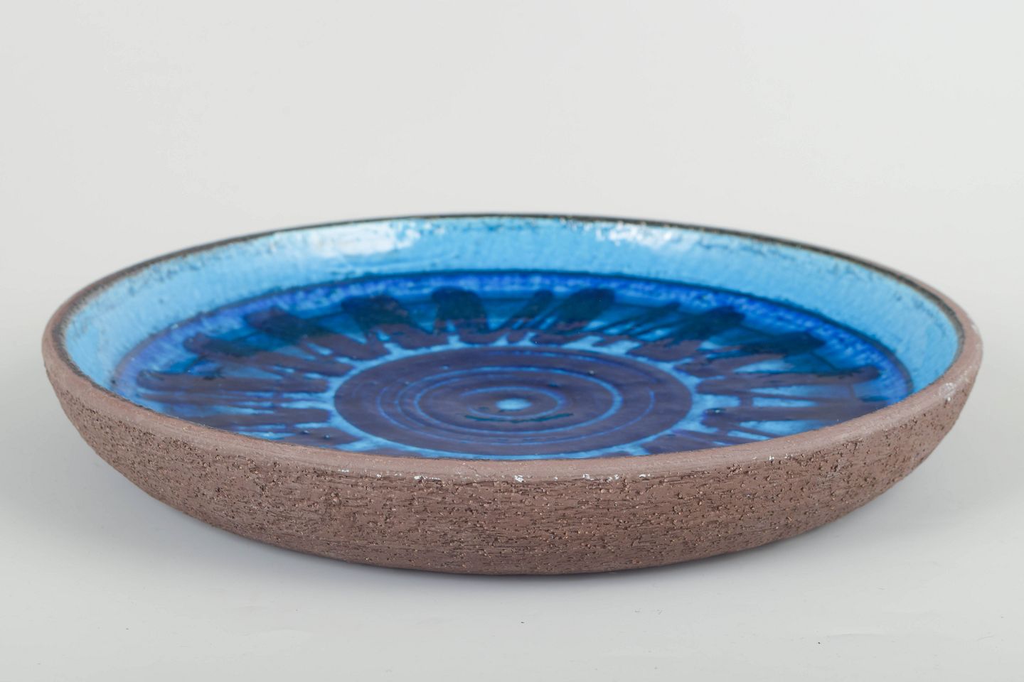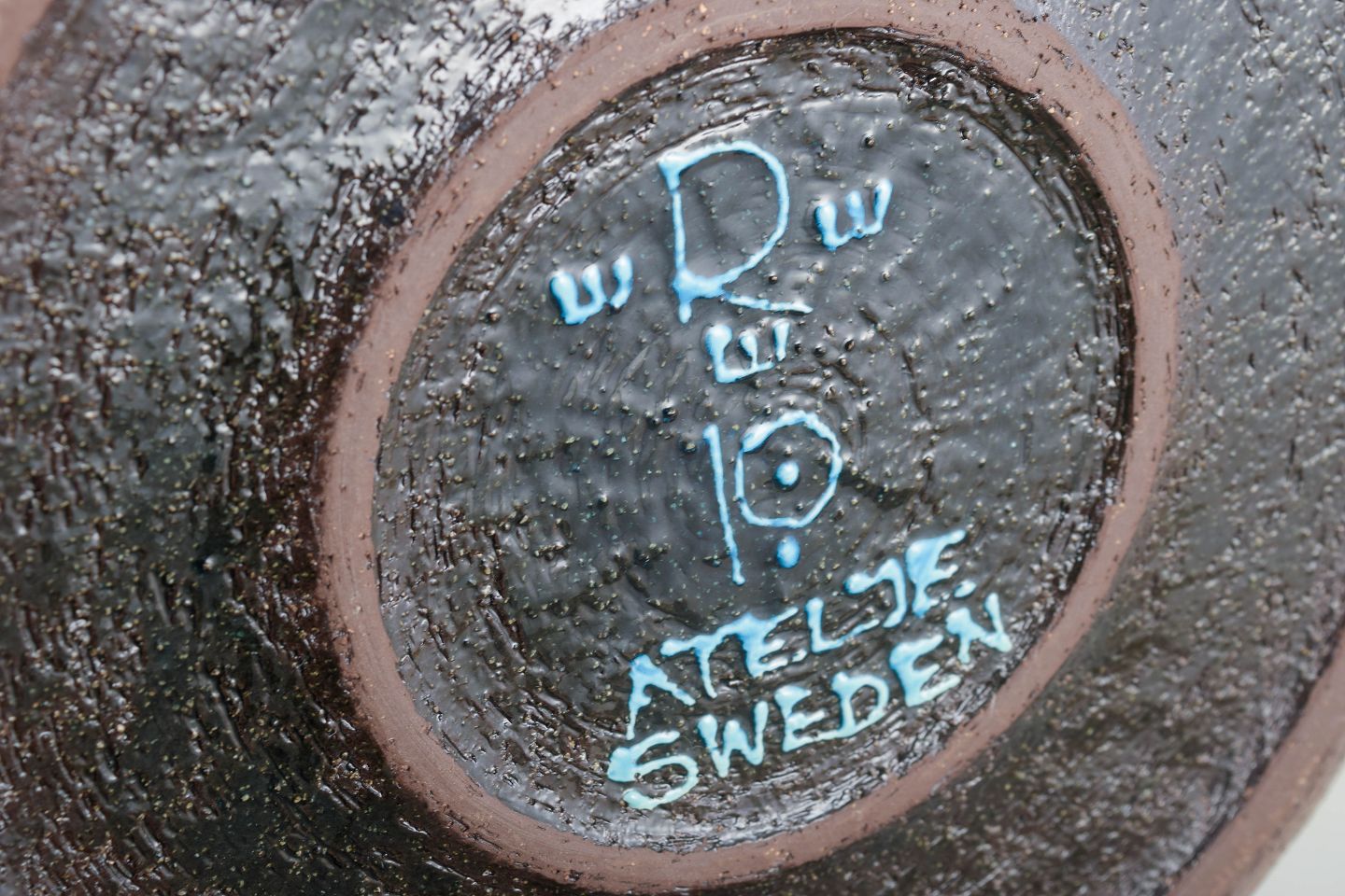 Stoneware dish with hand-painted decoration in deep blue tones, characteristic of Persson’s work within Rörstrand’s atelier production. Concentric rings and radial brushstrokes create a dynamic, graphic expression.