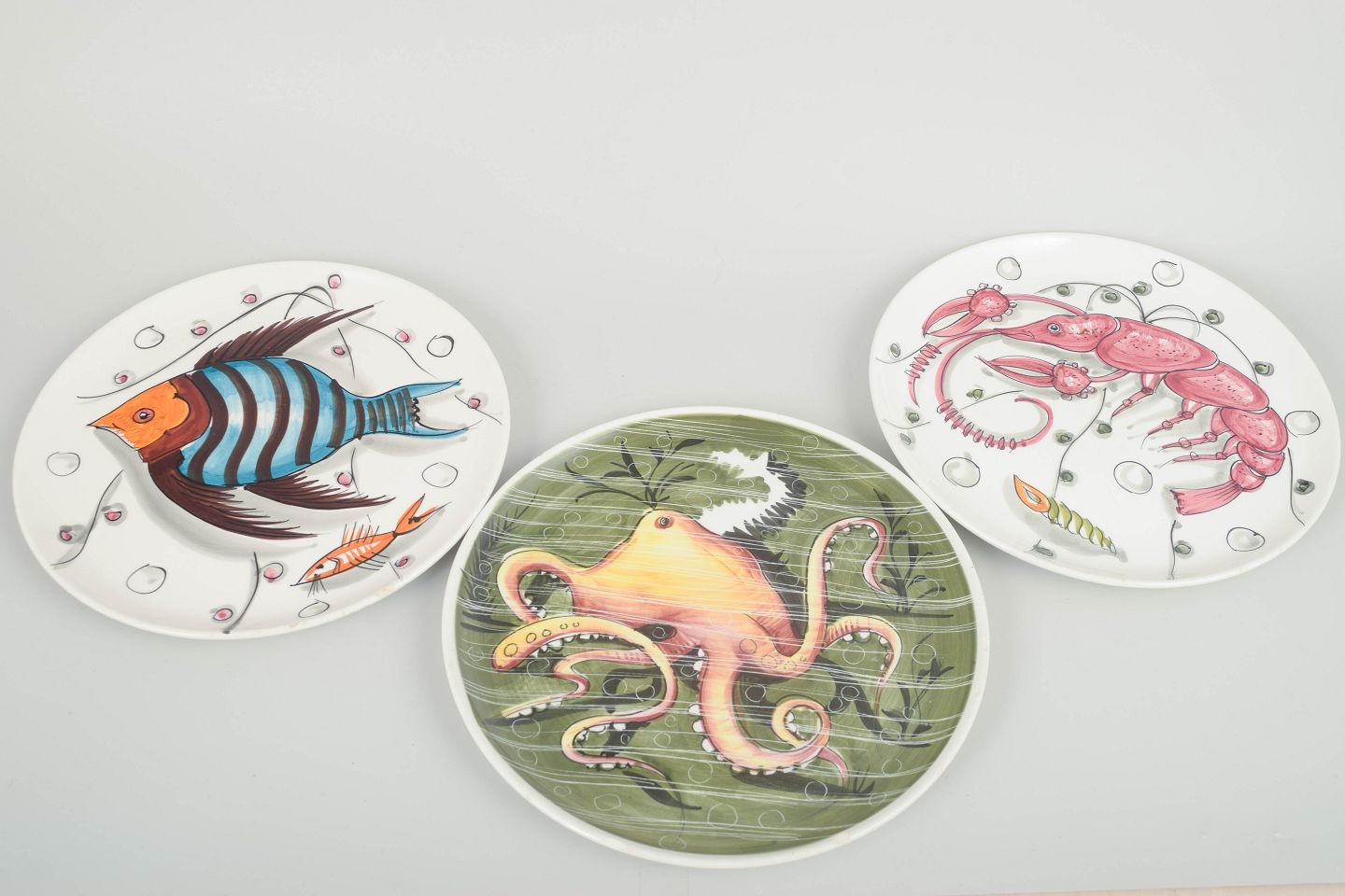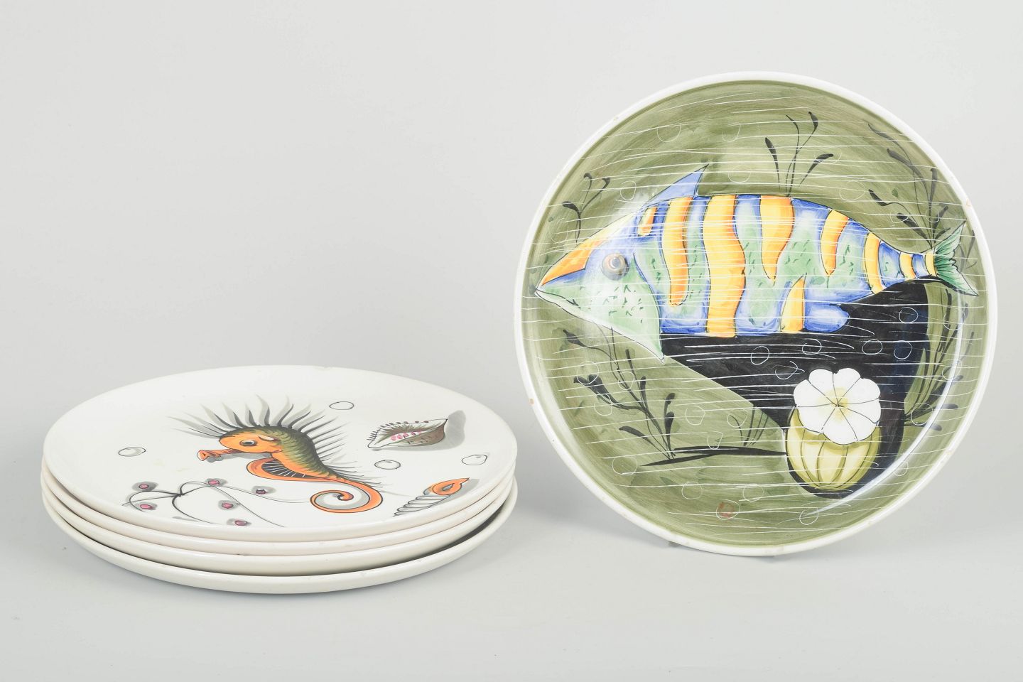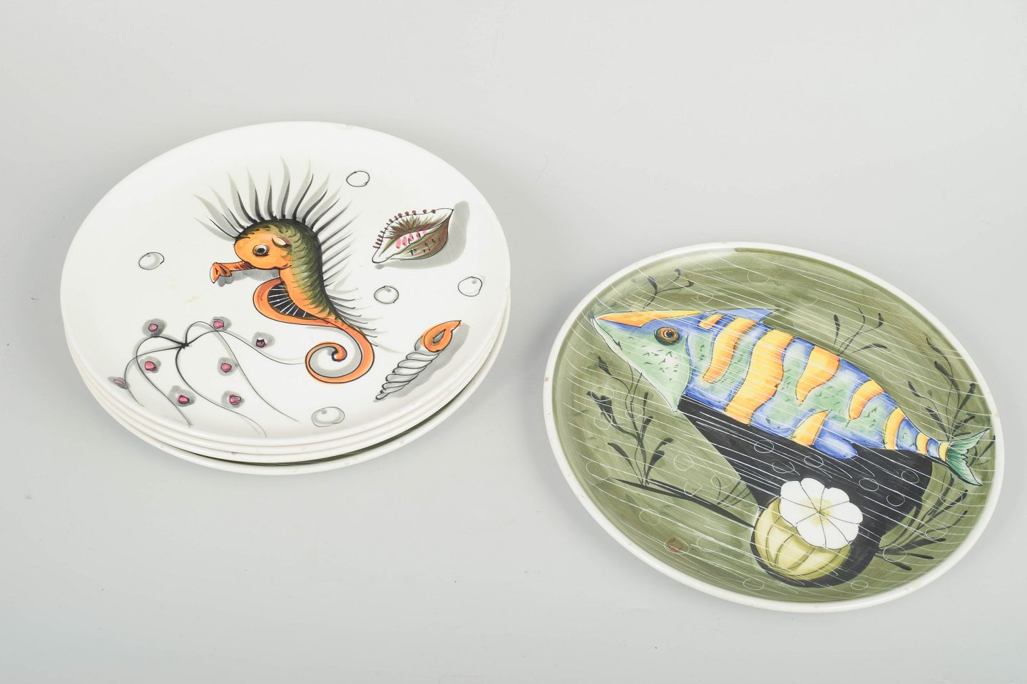 Set of five hand-decorated faience plates with colourful motifs and classic Italian design. Some small chips.