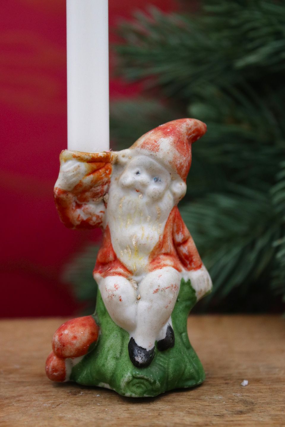 Small biscuit gnome with a nice patina that holds a small Christmas candle. Height: 7.5cm.