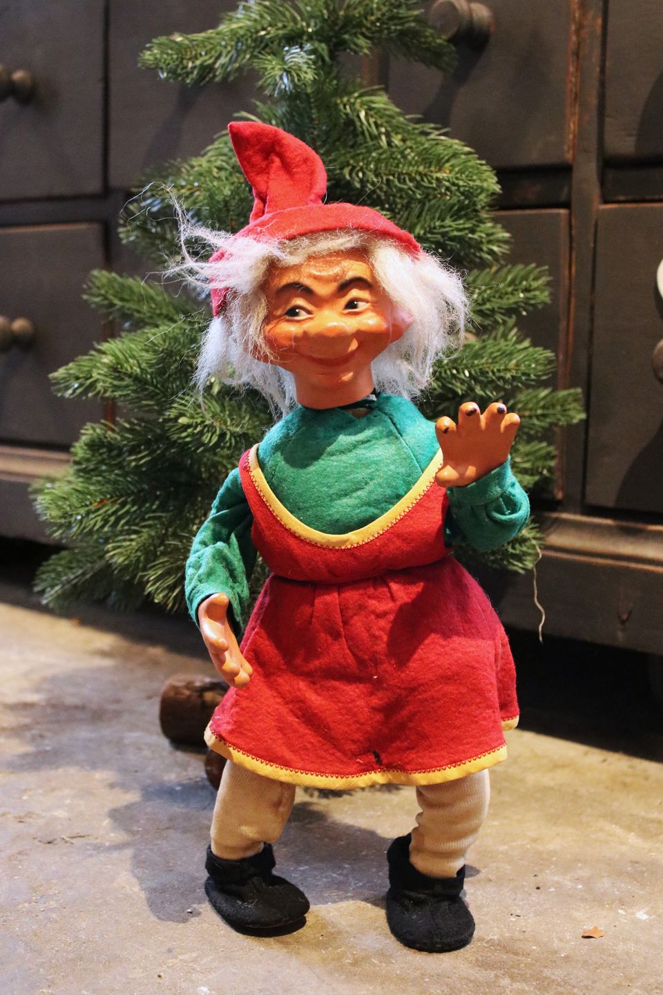 2 old shop elves with felt clothes and faces in painted papier-mâché. (Mother and Father) Height: 40cm. Sold individually!