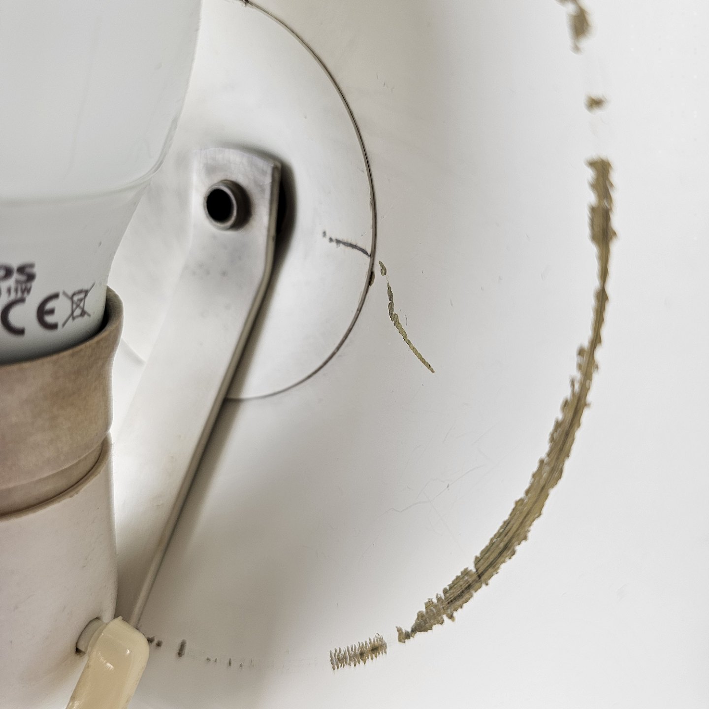 Fremstår med brugsspor i form af pletter på foden og afmærkninger på indersiden af skærmen