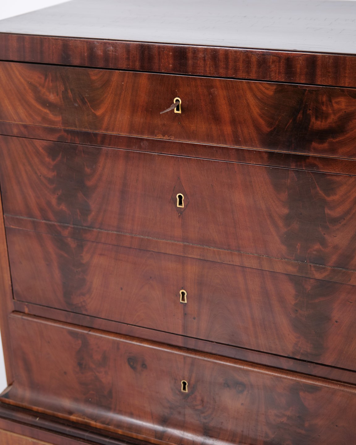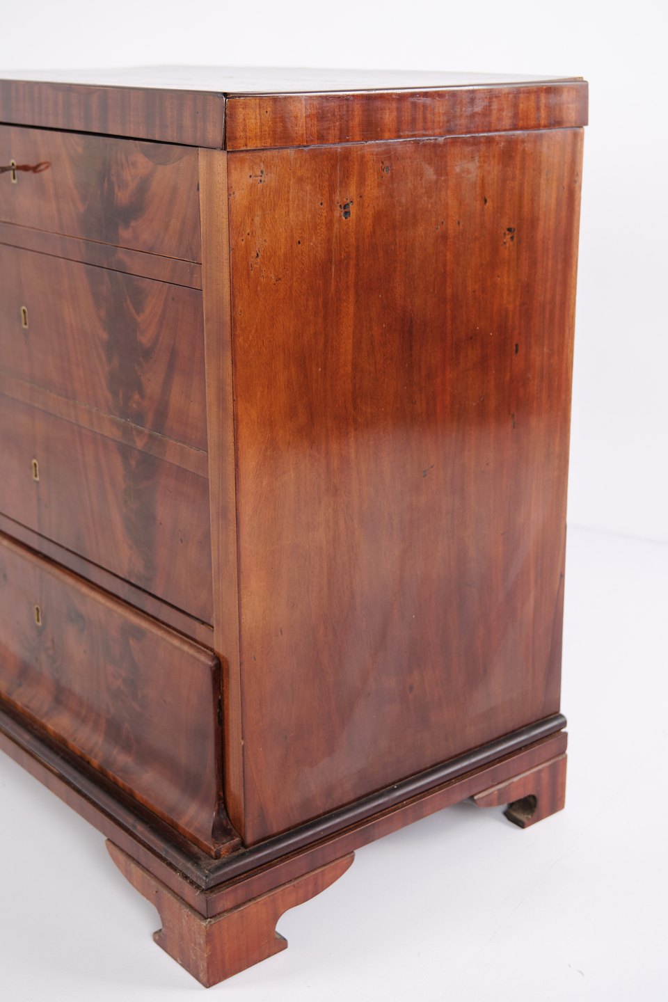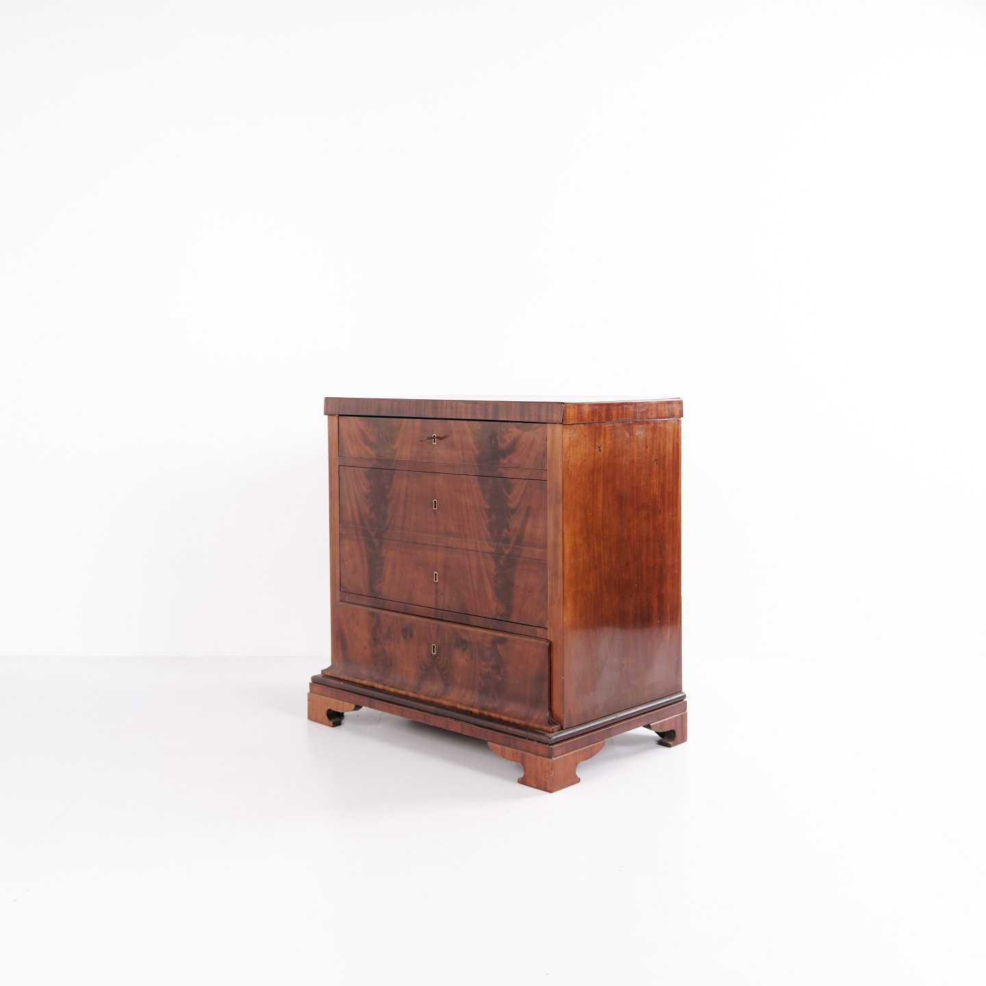 Late Empire chest of drawers from the 1840s, crafted in flame mahogany with four drawers on a plinth base. The surface has been gently French hand-polished, enhancing the depth and natural glow of the wood. A beautiful and classic antique piece from the period.