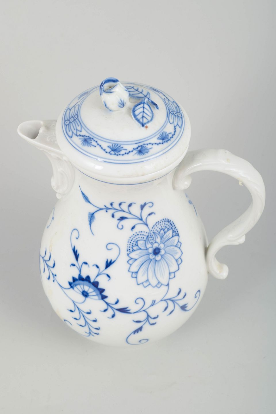An elegant and generously shaped coffee pot in the classic Zwiebelmuster (Blue Onion) pattern, hand-painted in cobalt-blue underglaze. The curved body, pronounced handle, and original lid reflect Meissen’s characteristic design language around 1900.