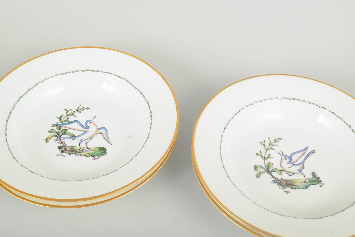 Rare deep porcelain plates by Royal Copenhagen featuring a bird and botanical motif (model 550/8107). Each plate has a gilded rim and a refined basket-weave relief along the edge.