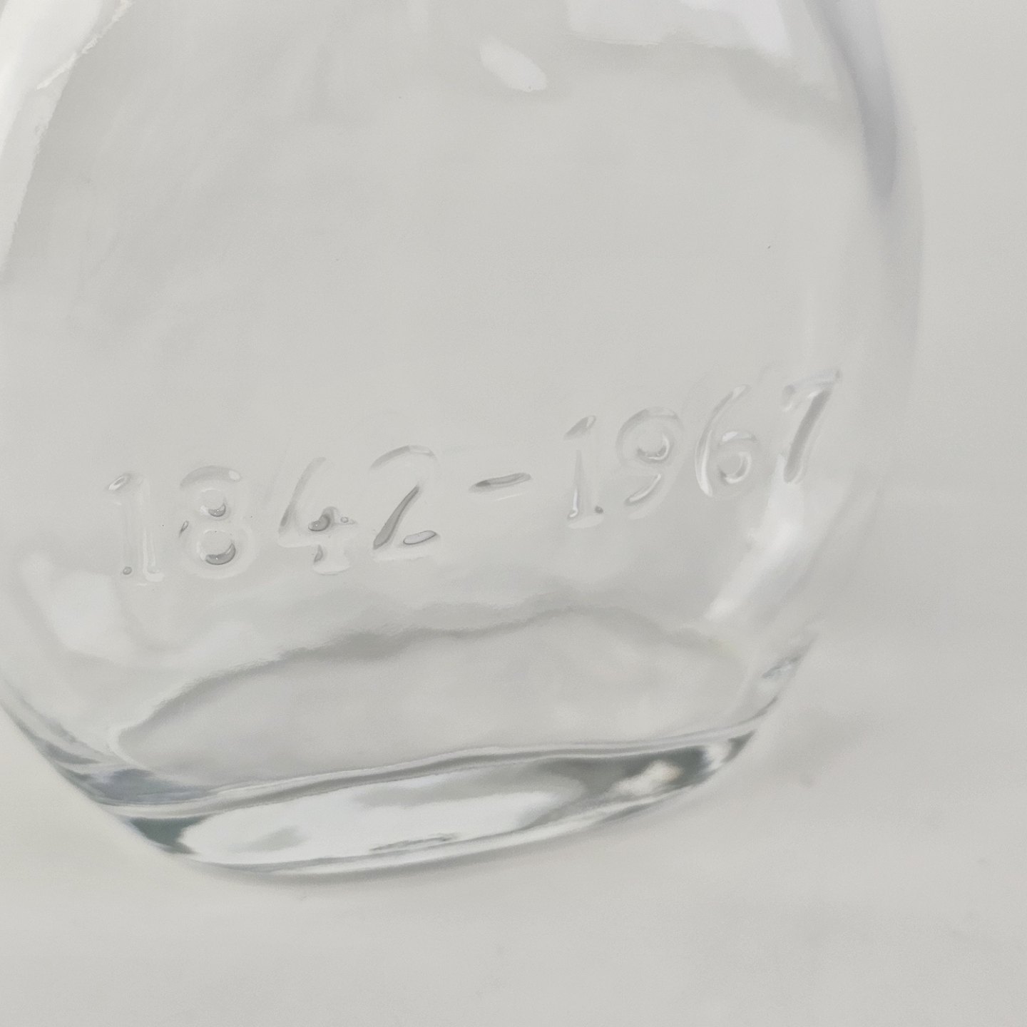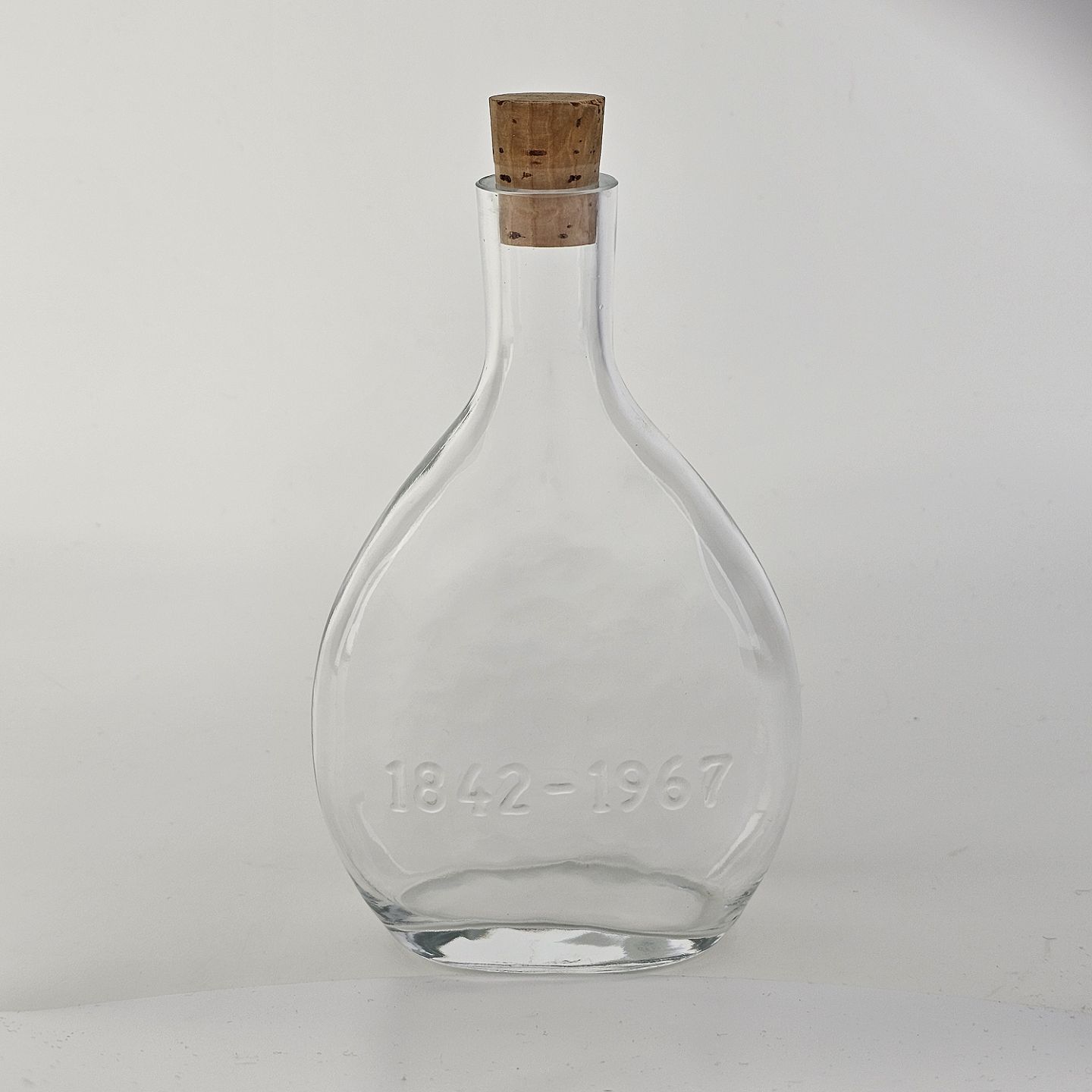 Brændevinsflaske med korkprop og teksten 1842-1967
