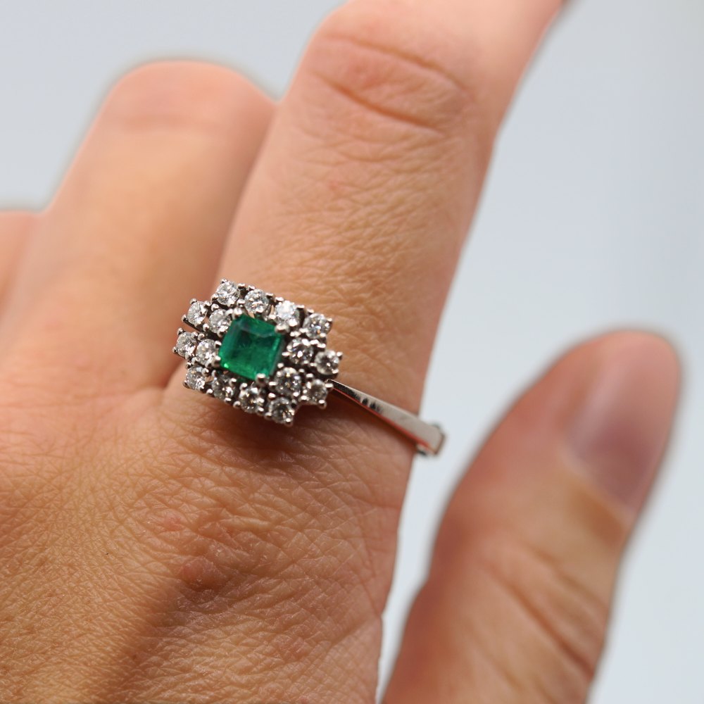 Carl Antonsen; Ring in 14k white gold, set with diamonds and emerald. Around size 61, but fleksible in size.