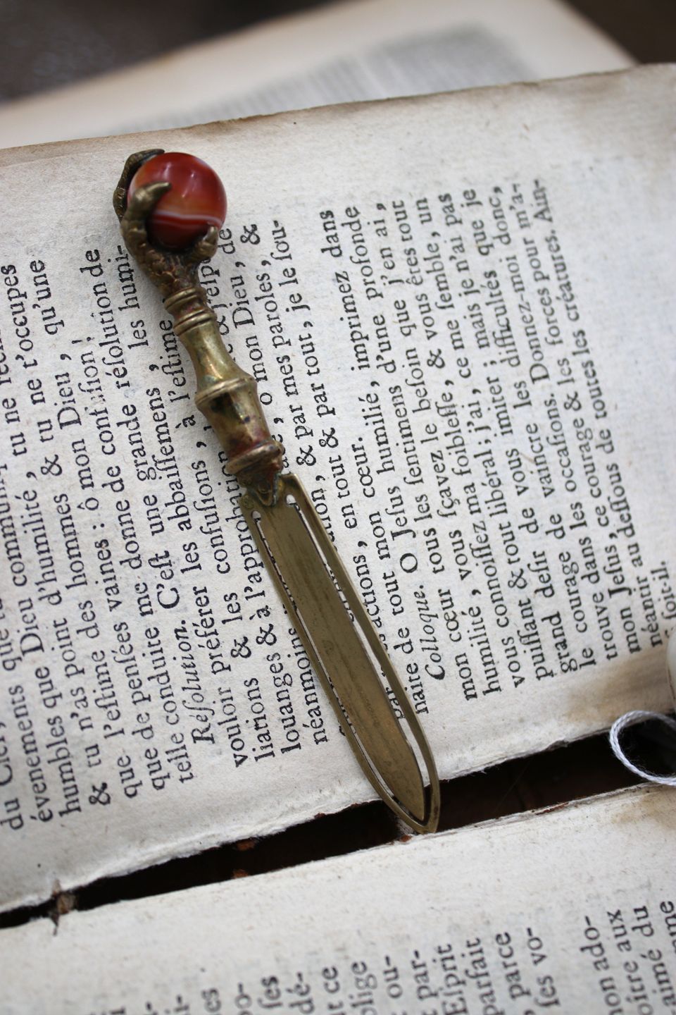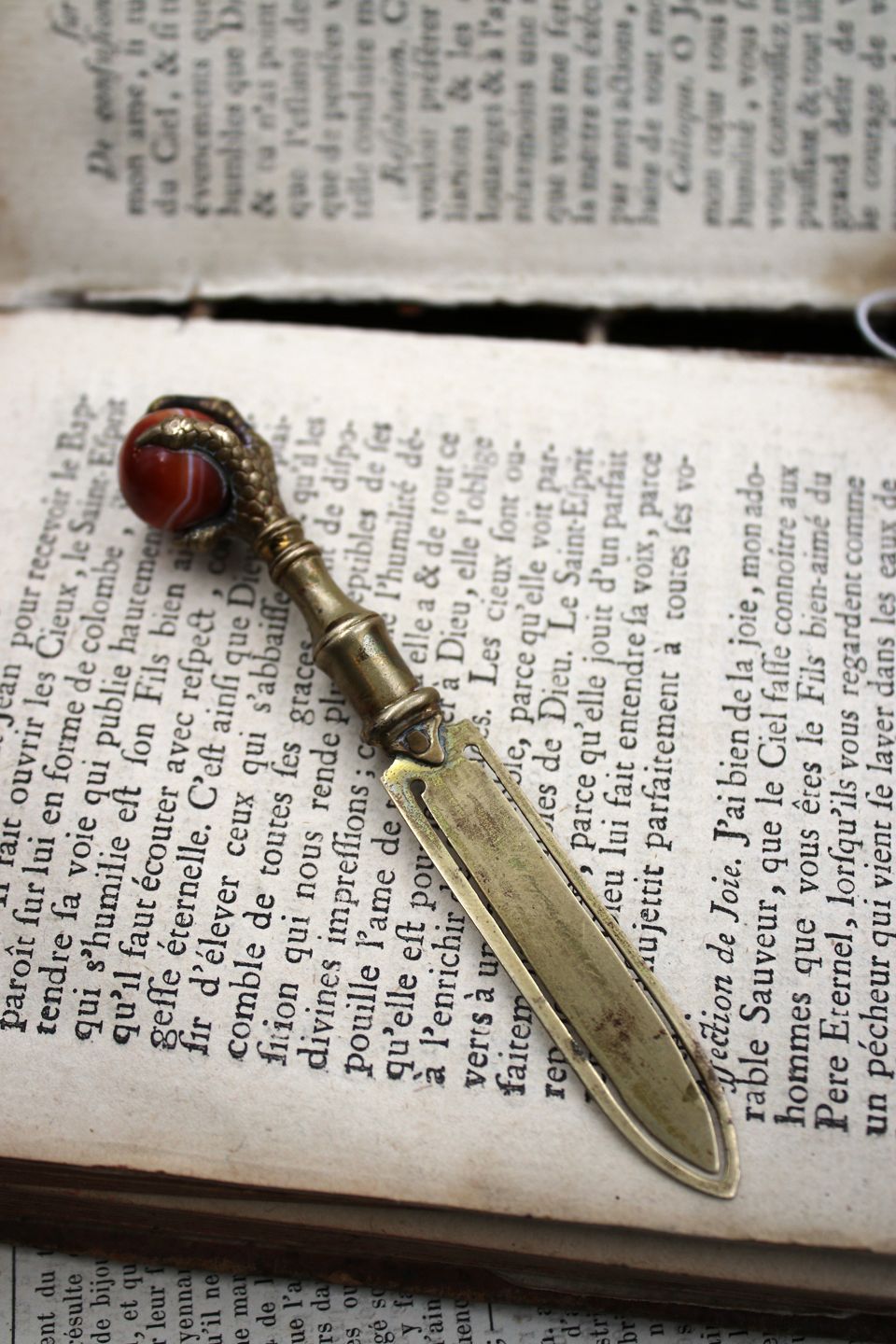 Antique 19th century brass bookmark with an eagle's claw gripping a marble ball. Length: 10cm.