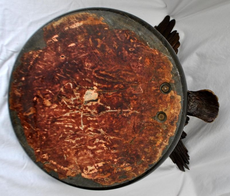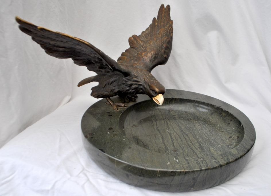 Large French bronze eagle mounted on a marble dish, art nouveau, circa 1900. Eagle with spread wings and ivory beak. Marble platter in green. Platter dia: 35 cm. Eagle: W: 40 cm. H.: 23 cm.