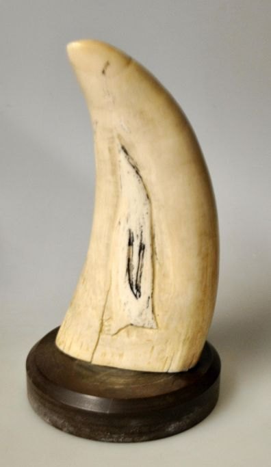 Greenlandic sperm whale tooth mounted on a bakelite base. 19th-20th century. One side decorated with a carved bird. H.: 13.8 cm. Height with base: 16 cm.