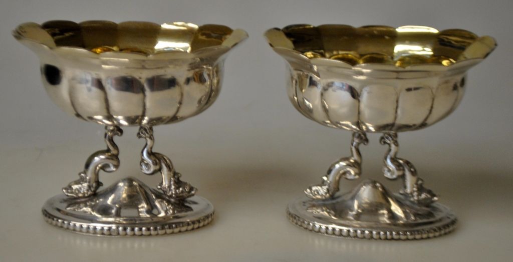 Jürgen Joachim Jürgensen (1779 - 1837) Sønderborg, Denmark: Pair of Danish rococo silver salt shakers, 1828. The salt shakers are held by two dolphins. Inside gilded. Stamped. H.: 6.5 cm. L.: 8.4 cm.