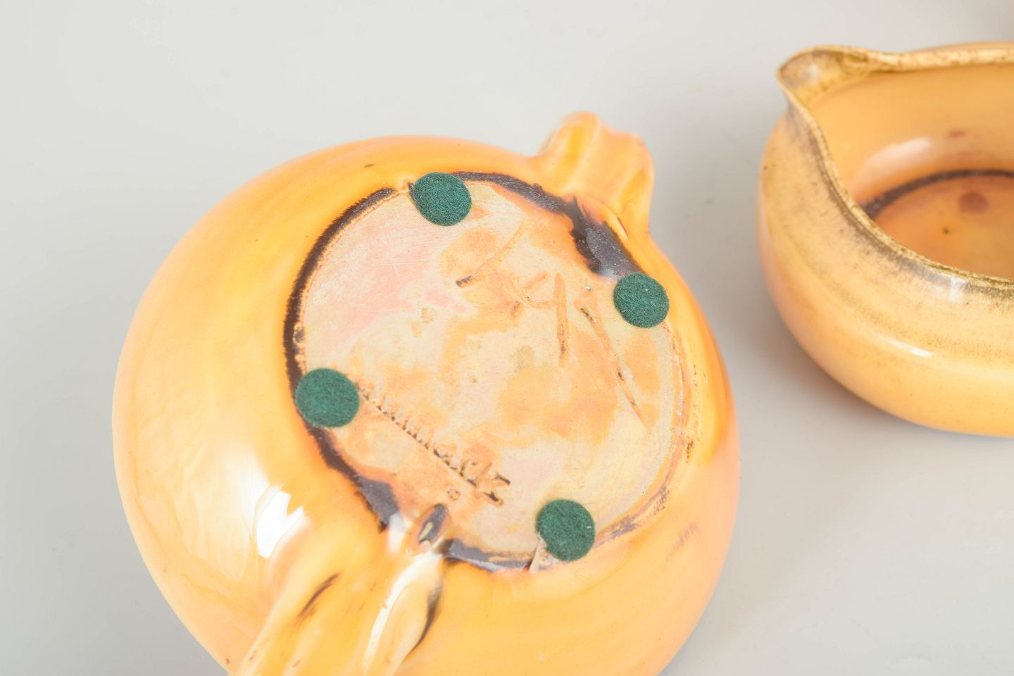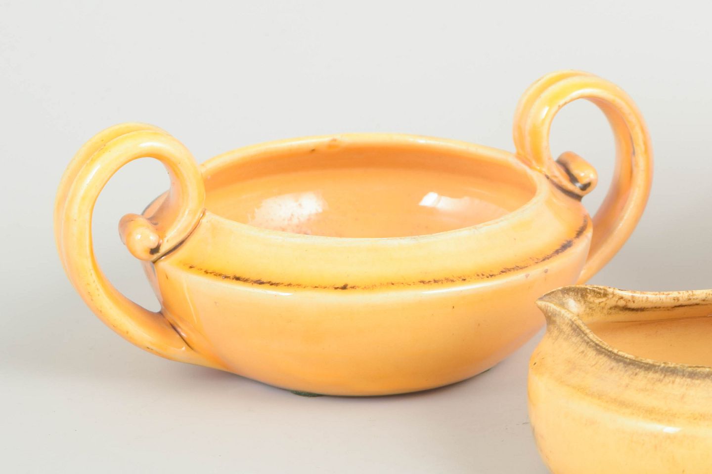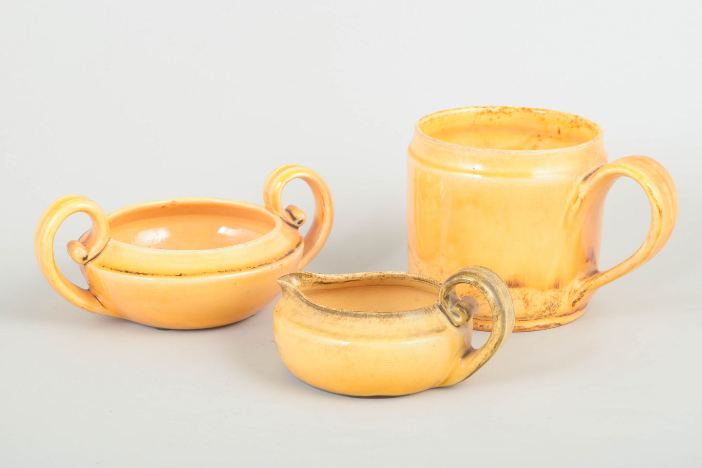 Three pieces in the classic warm yellow-orange Kähler glaze of the 1930s. The set includes a small creamer with decorative curved handle, a sugar bowl with twin spiral handles, and a larger mug/cup with pronounced handle. Attractive proportions and characteristic handcrafted styling.