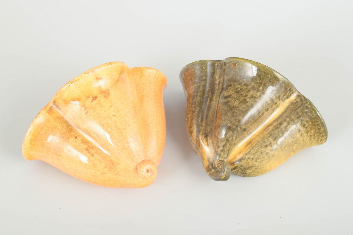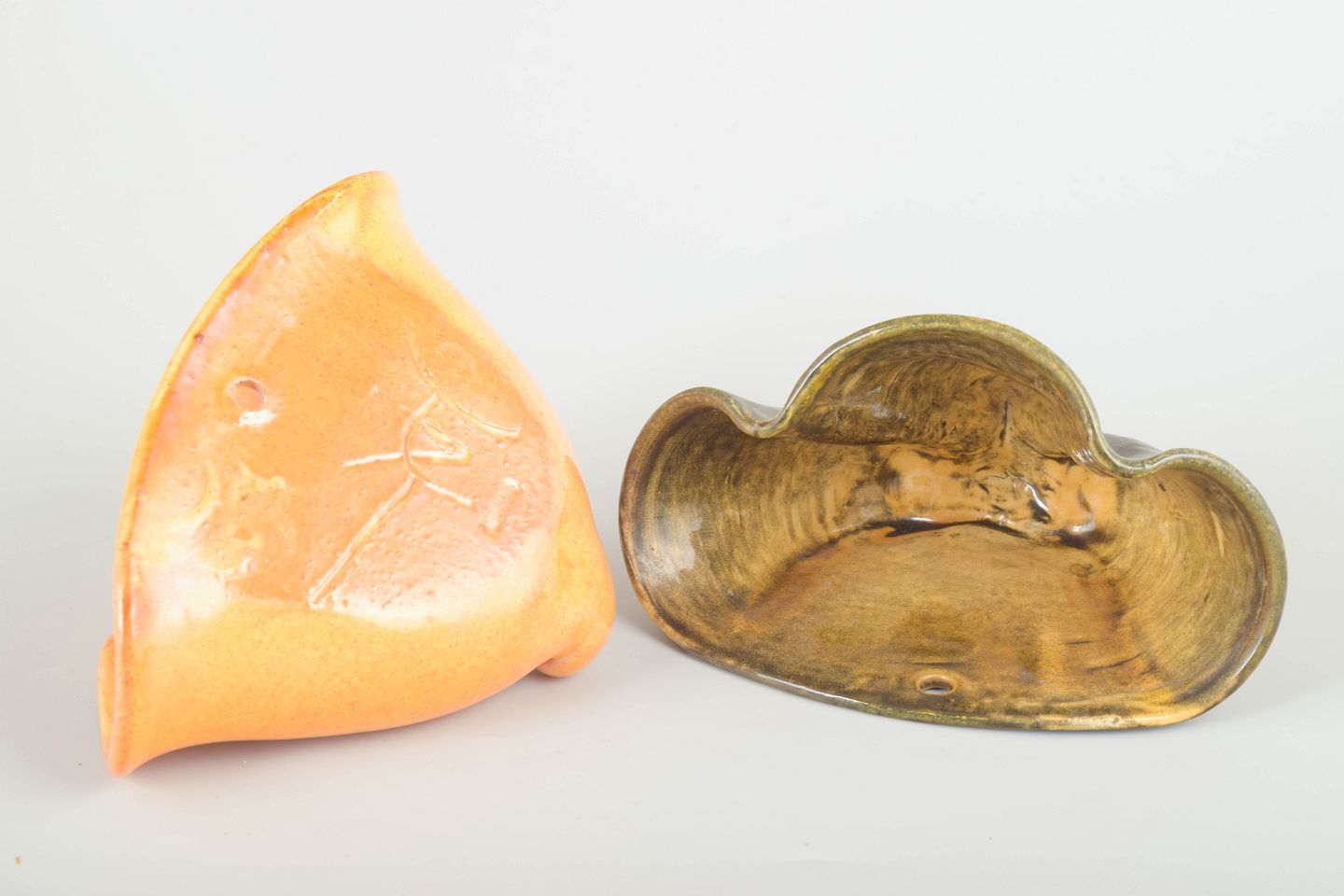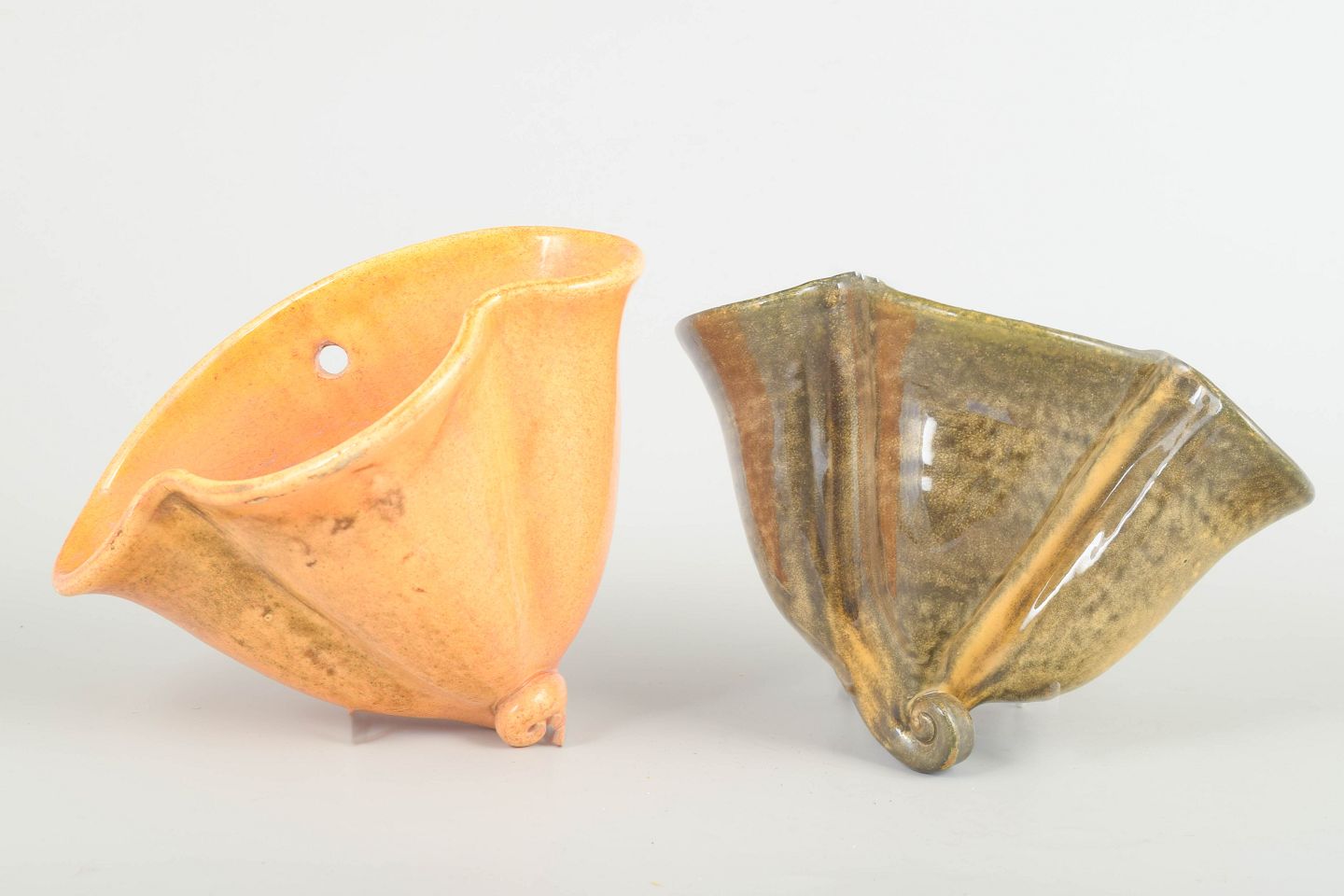 Two decorative wall-hanging herb pots in moulded ceramic from the 1930s, executed in Kähler’s characteristic organic forms. One features a warm orange-yellow uranium-type glaze, the other a brown-green glaze with textured variation. Both with small curled foot details and hanging hole.
