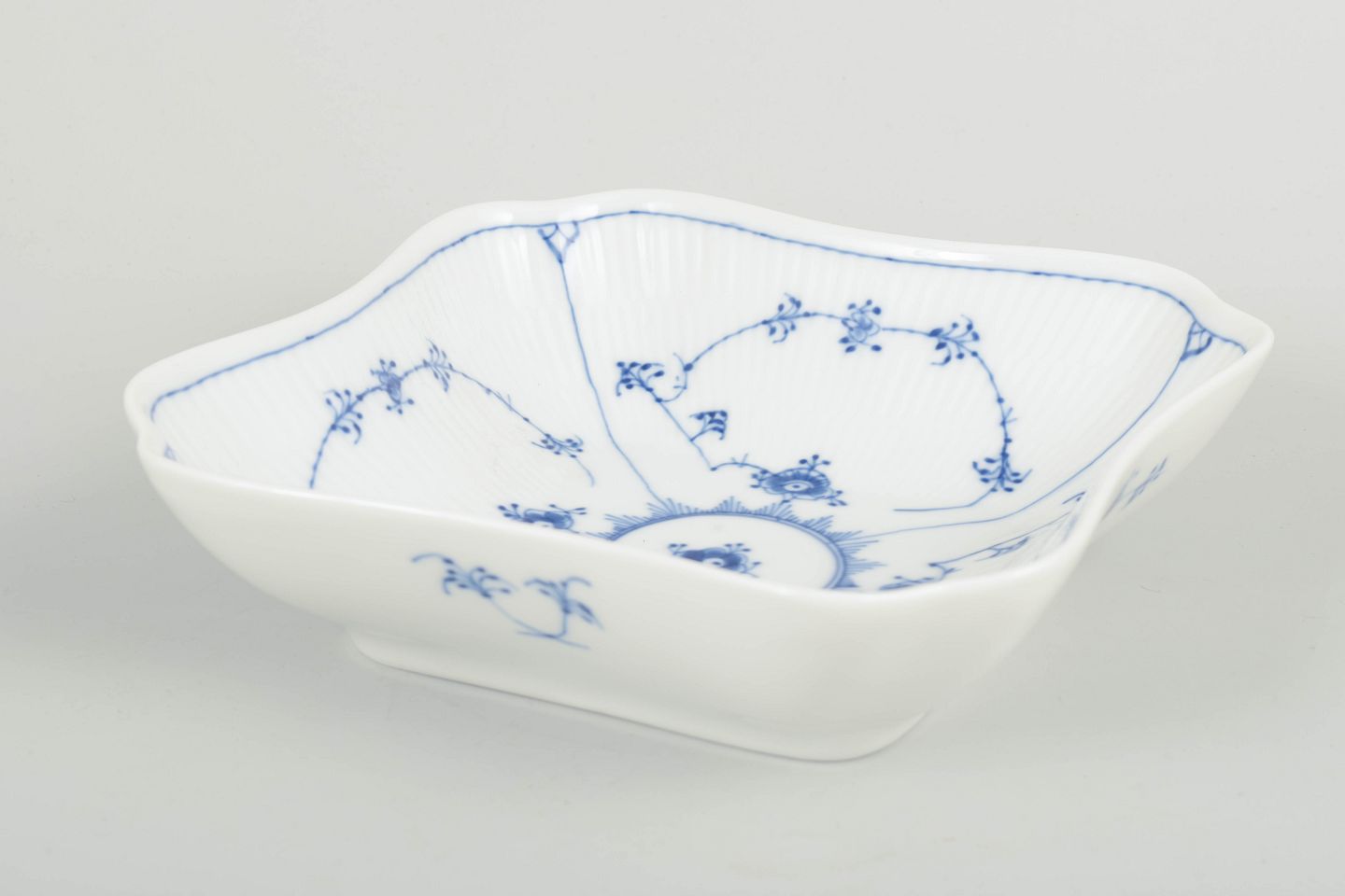 Elegant squared bowl in the Blue Fluted Plain porcelain series with softly waved edges and hand-painted cobalt-blue decoration on a fluted body. A decorative and functional form typical of Royal Copenhagen’s late 20th-century production.