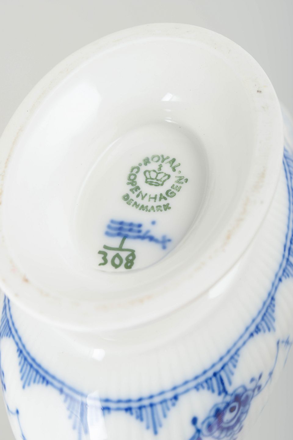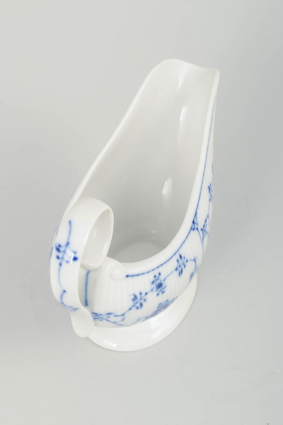 Classic sauce boat in the “Blue Fluted Plain” porcelain series, featuring an elegantly curved handle and hand-painted cobalt-blue decoration on a fluted body. A well-preserved example from Royal Copenhagen’s late 20th-century production.