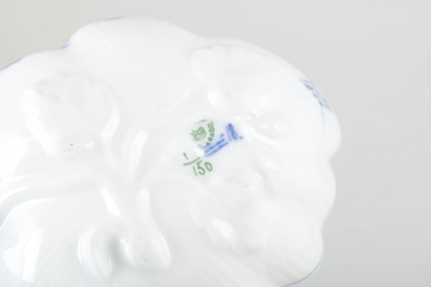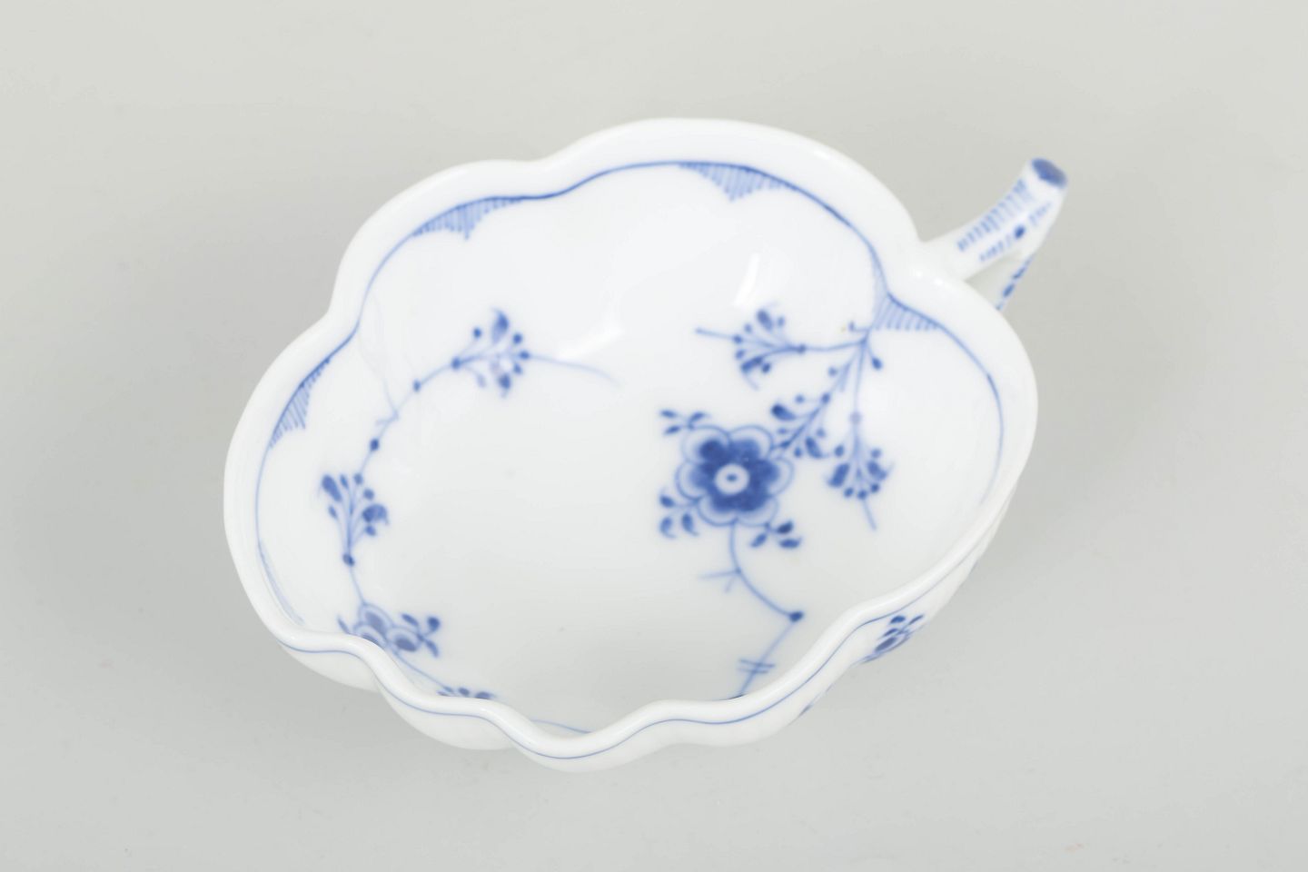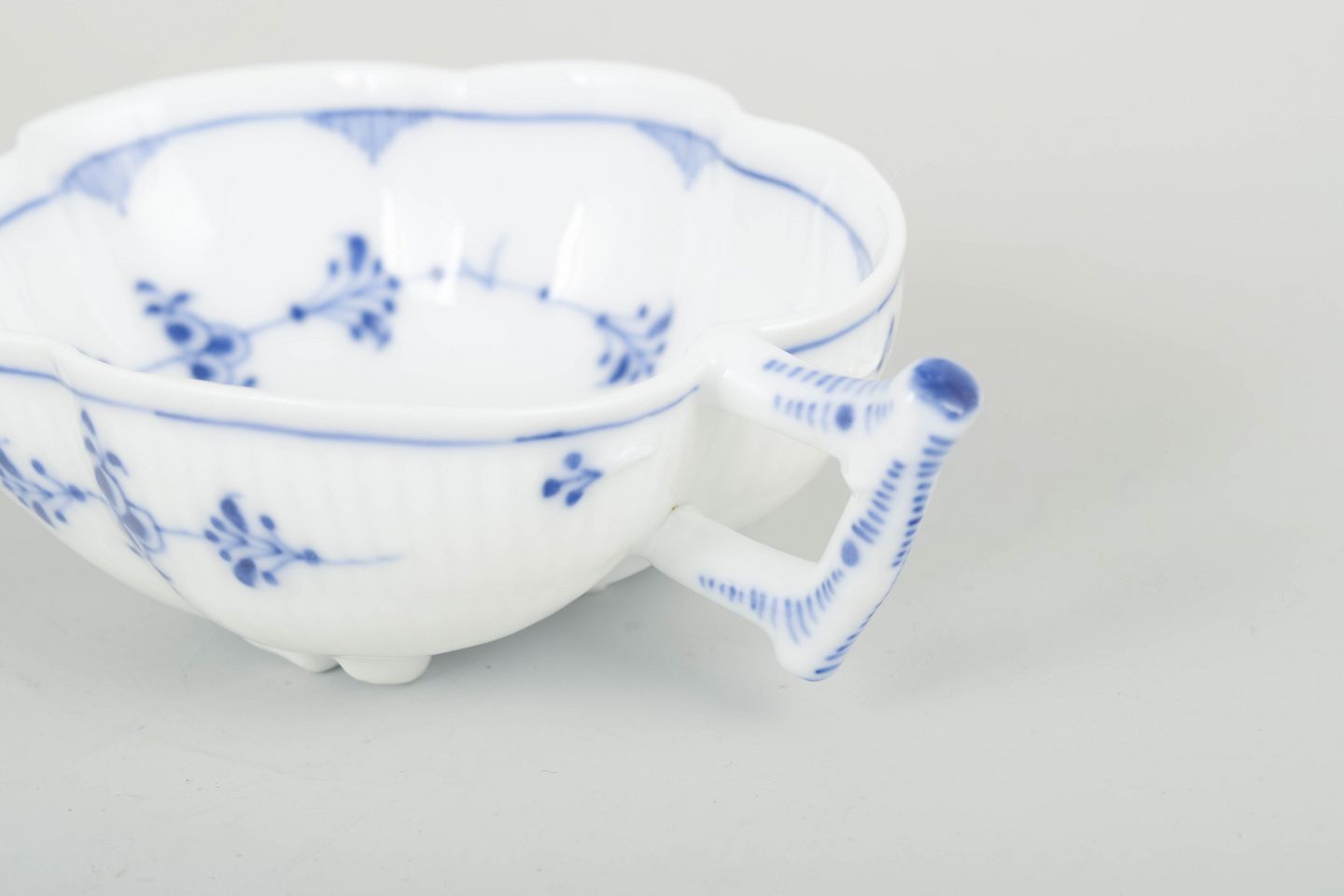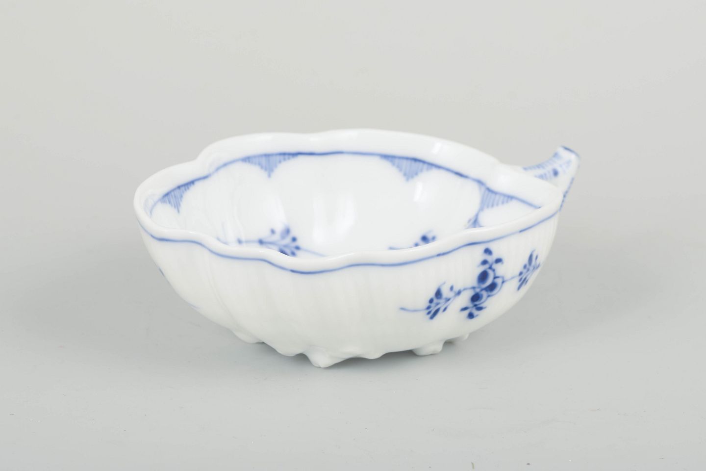 Small decorative bowl in the Blue Fluted Plain porcelain series, shaped with a shell-like profile and small feet. Hand-painted in classic cobalt-blue decoration on a fluted body – a charming example from Royal Copenhagen’s early 20th-century production.