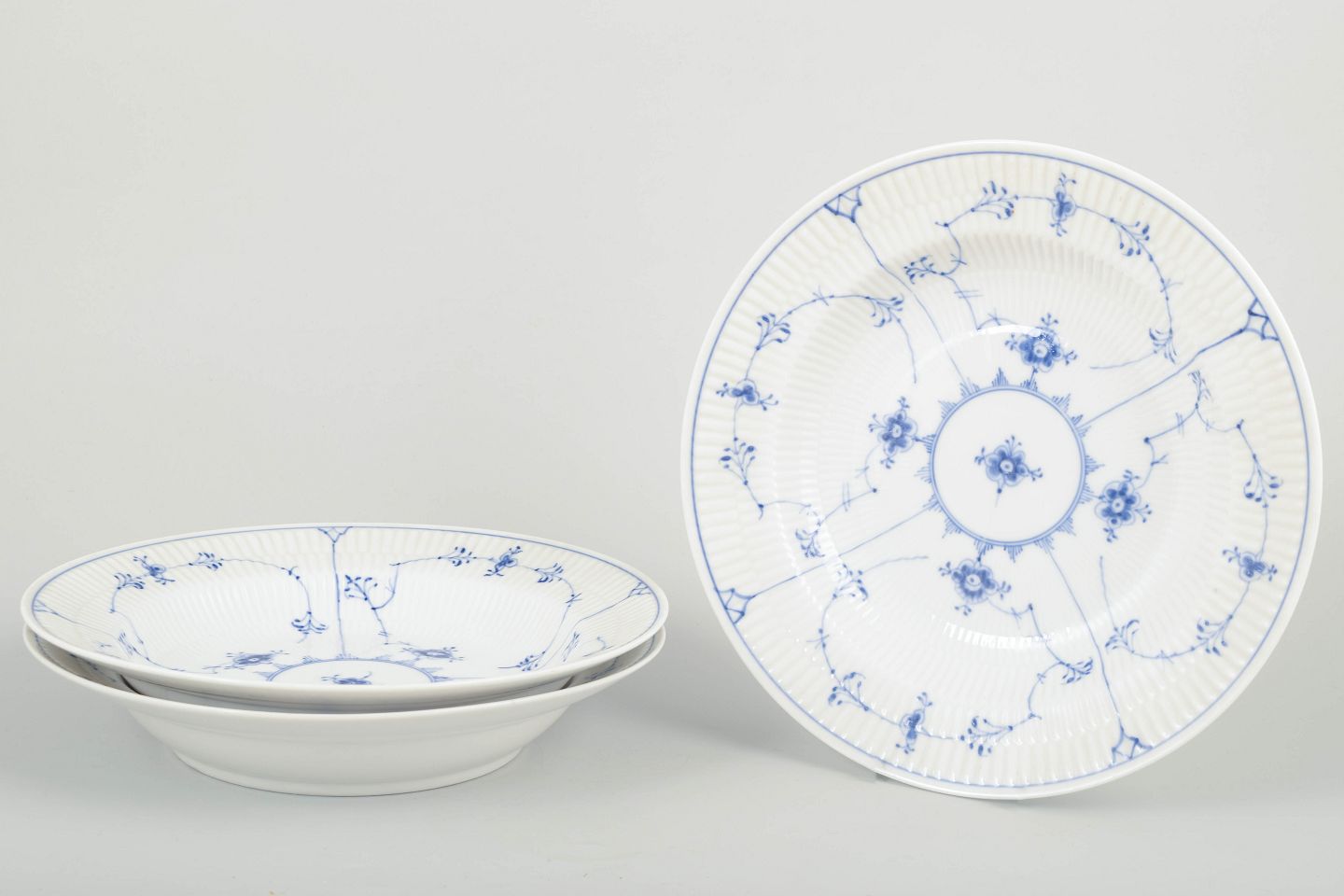 Set of three deep plates in classic “Blue Fluted” porcelain with hand-painted blue decoration and fluted body. A refined and early 20th-century example of Royal Copenhagen craftsmanship.