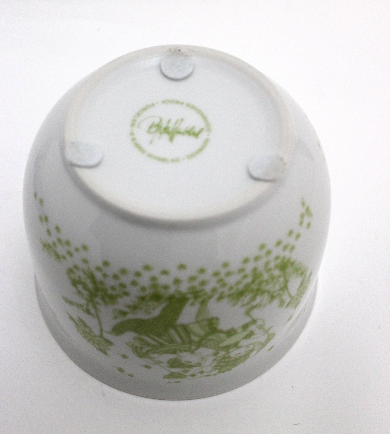 Text available in Danish: Bjørn Wiinblad, Urtepotteskjuler med limegrønt motiv med et par der fanger sommerfugle. Nyproduceret. Dishwasher proof. Højde 12,51 cm. Øverste diameter 16 cm. Pris: 275 kr.