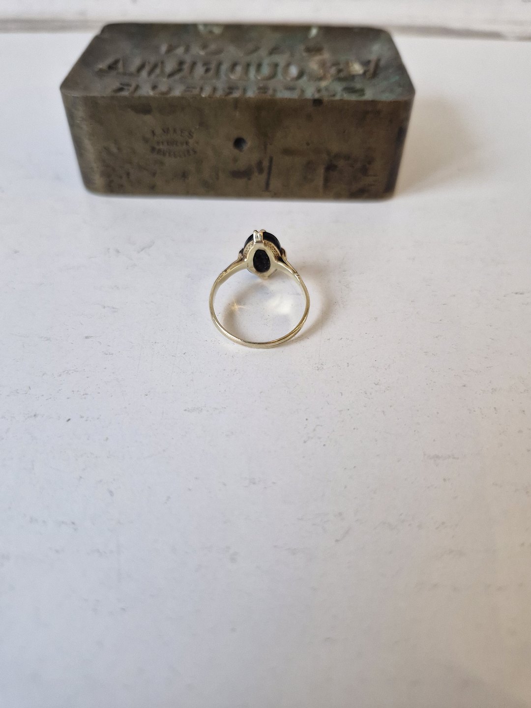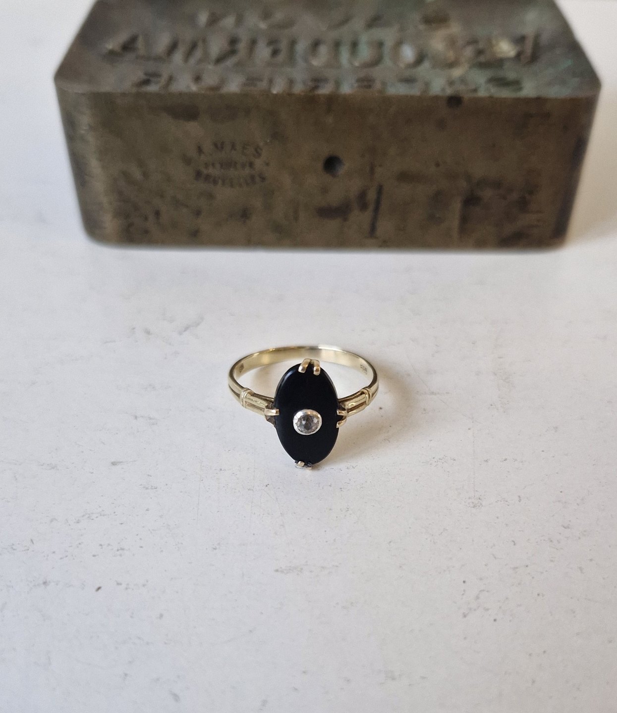 Beautiful old ring in 14 kt. gold with oval onyx adorned with old cut diamond