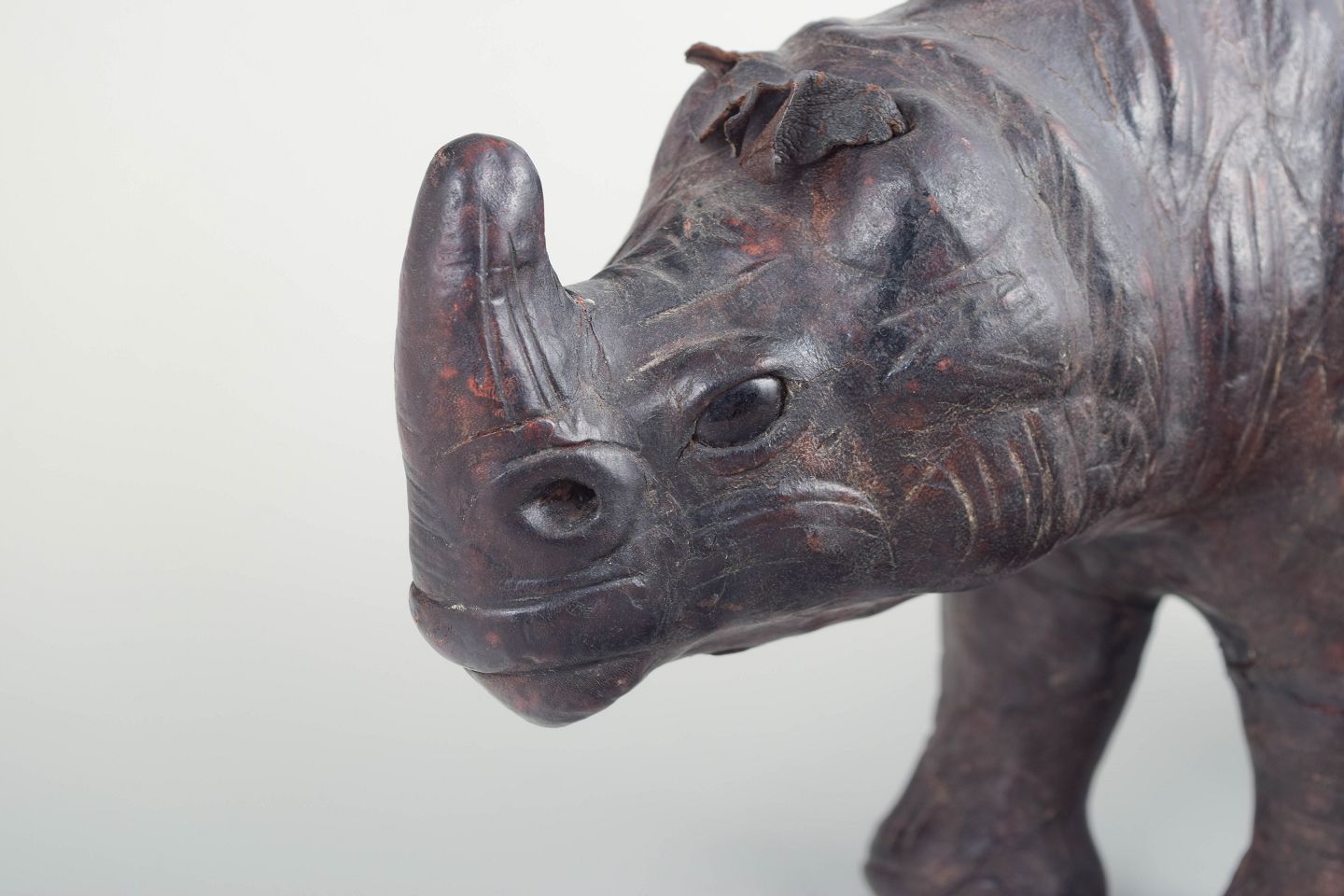 Handmade rhinoceros figure crafted in shaped and stitched leather, possibly retailed by Liberty & Co., London. Finely modelled details and natural patina emphasise the artisanal character of the piece.
