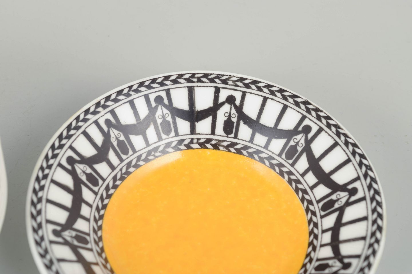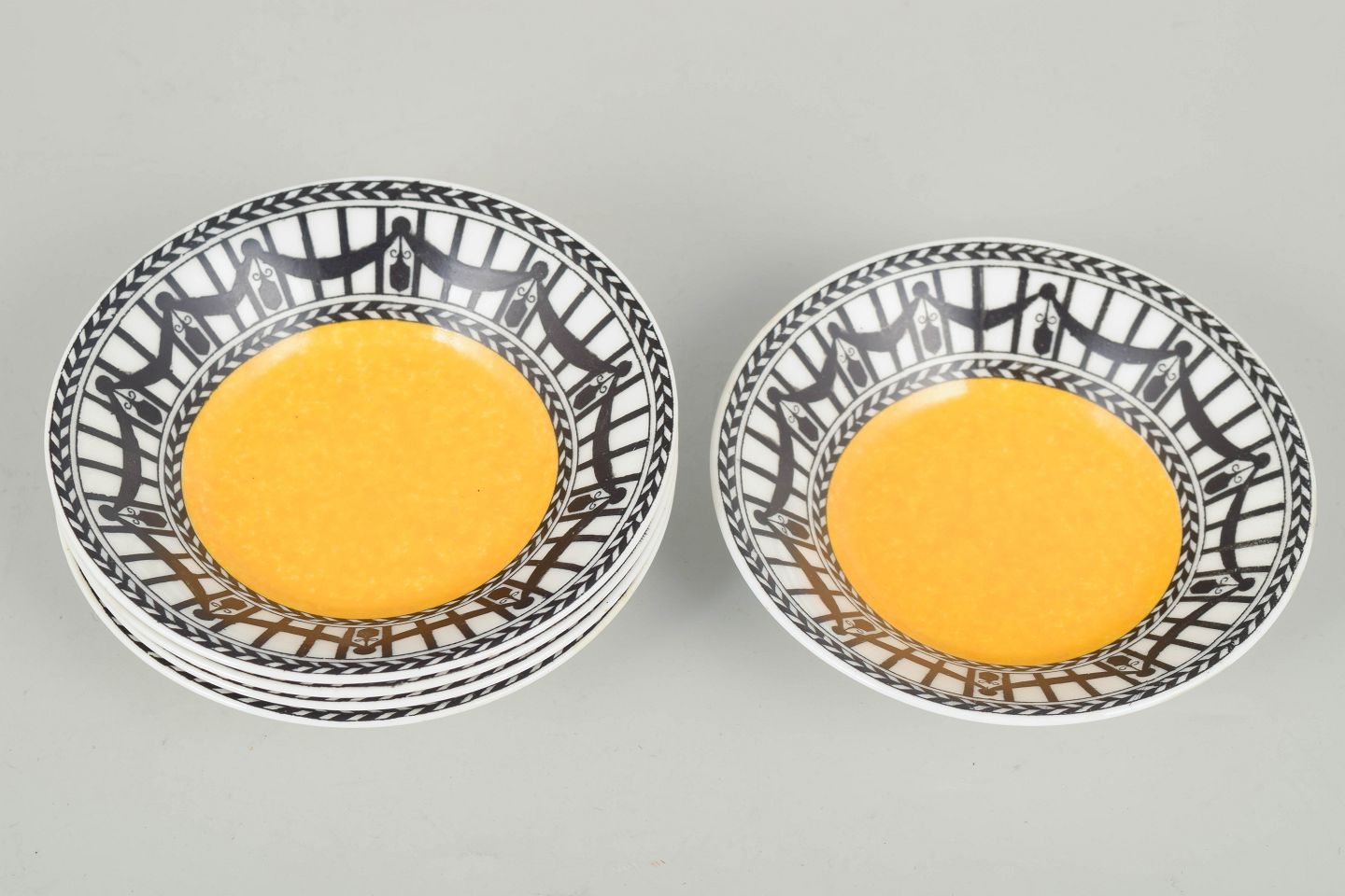 Five small faience bowls with a yellow centre and a decorative black-and-white geometric border, characteristic of the ornamental style of the period.