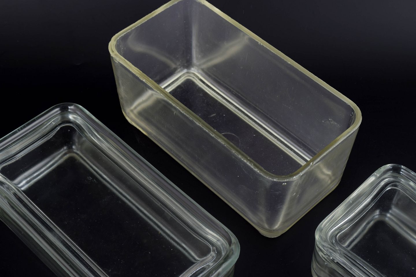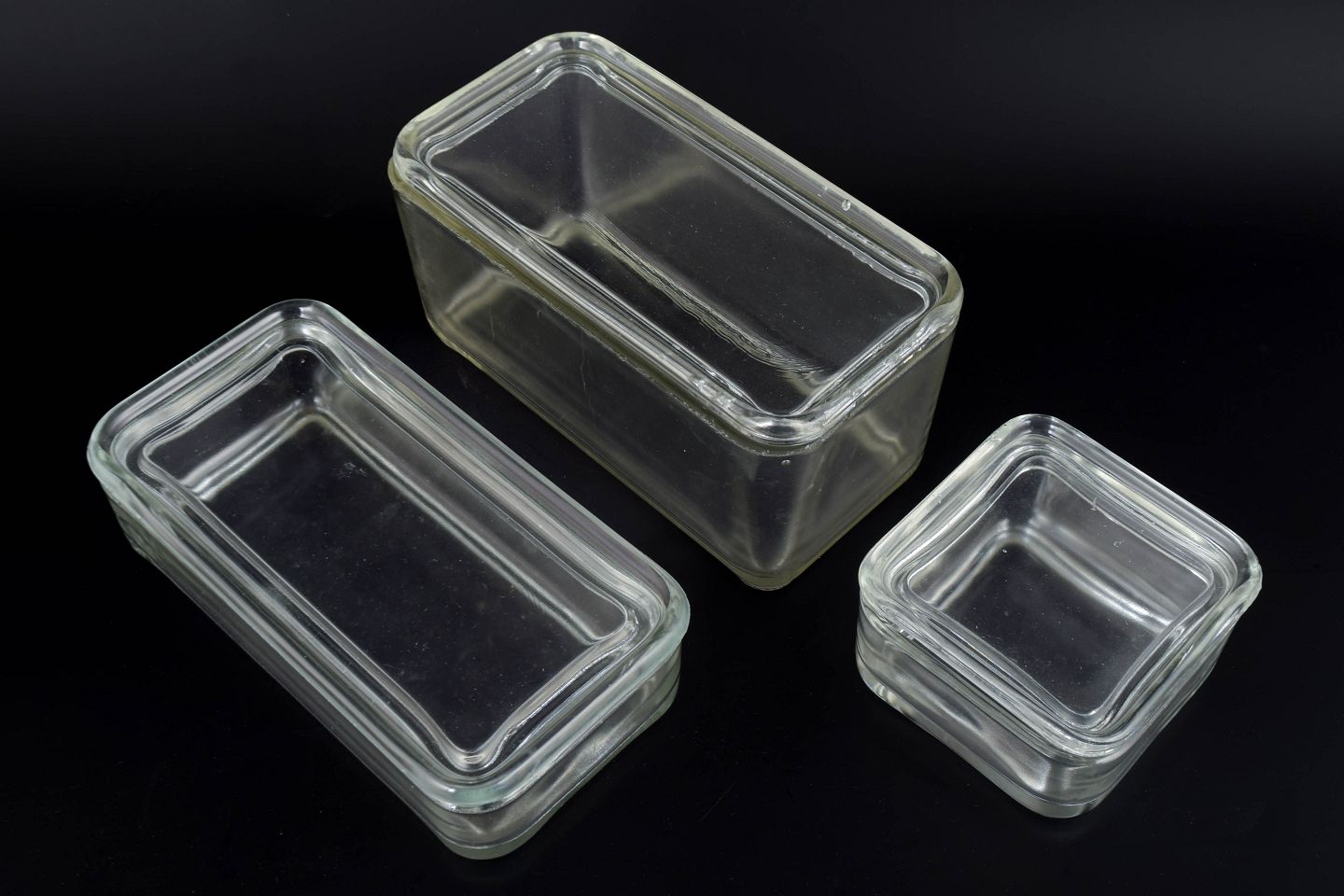Set of three rectangular clear-glass storage boxes from Wilhelm Wagenfeld’s iconic “Kubus” series. The series exemplifies functional Bauhaus design, combining pure geometry with everyday usability. Height range 5–9 cm, length 8–18 cm.