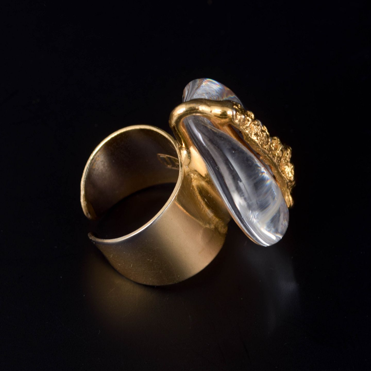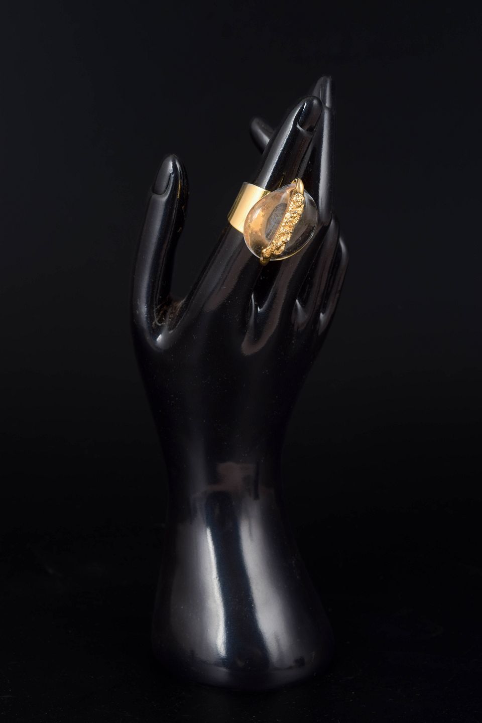 Sculptural ring featuring a solid silver band and a large organically shaped glass stone set in Hull’s signature dramatic style. The transparent stone carries a warm golden hue with a textured inner core, giving the piece a strong sculptural presence.