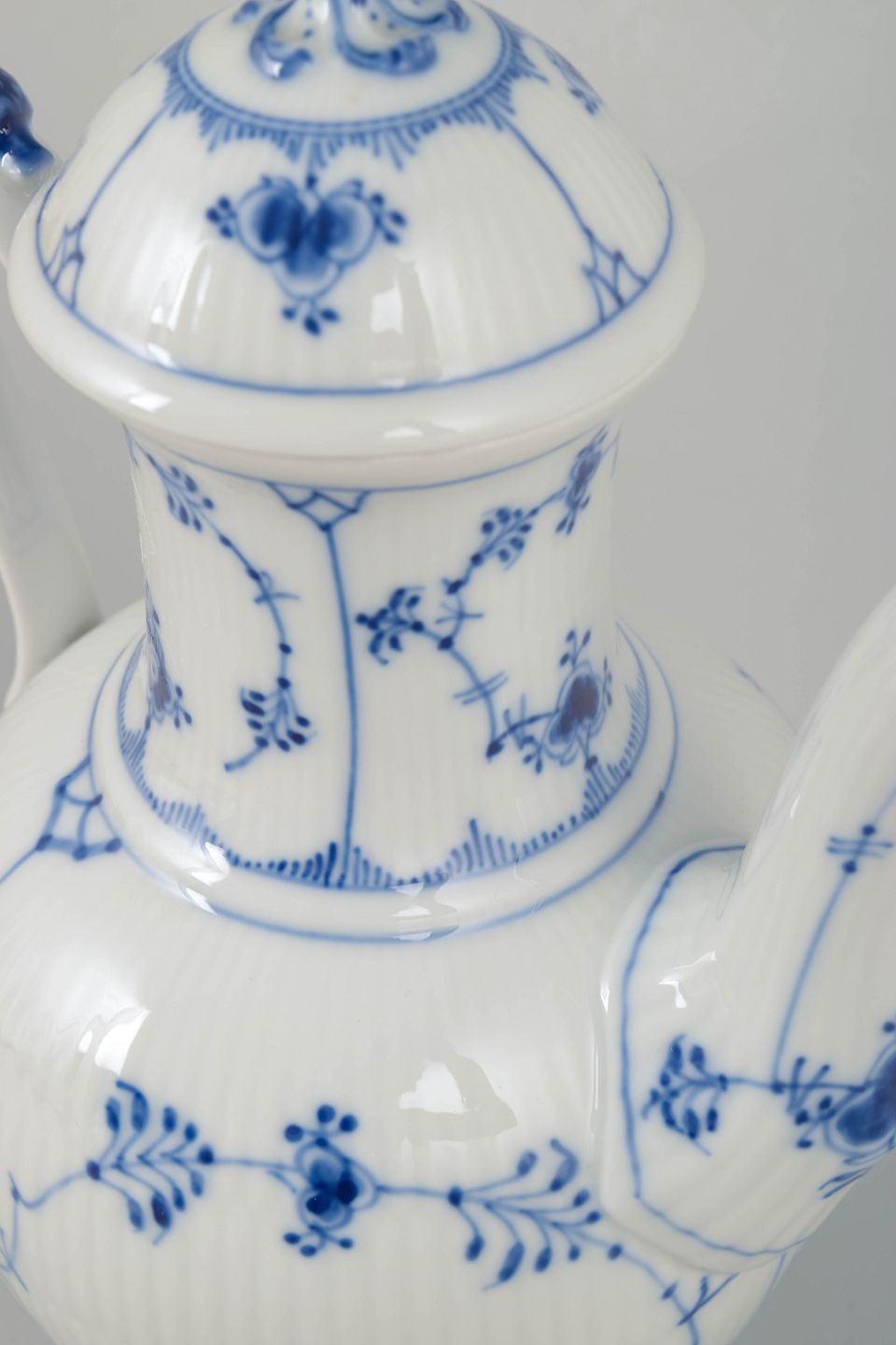 Elegant coffee pot in the classic Blue Fluted Plain pattern, model 1/48. Hand-painted decoration with fine blue details and a fluted body.