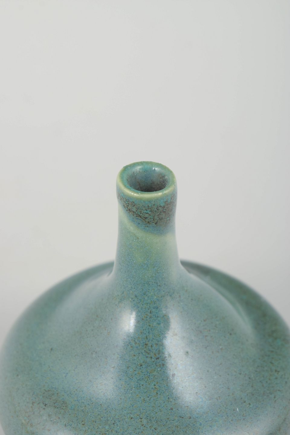 Small thrown stoneware vase with a rounded body and slender neck. The glaze features soft turquoise and green tones with subtle variation and transitions, characteristic of Scandinavian studio ceramics of the era. Signed Erik H. on the base.