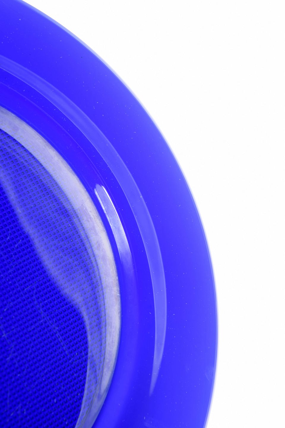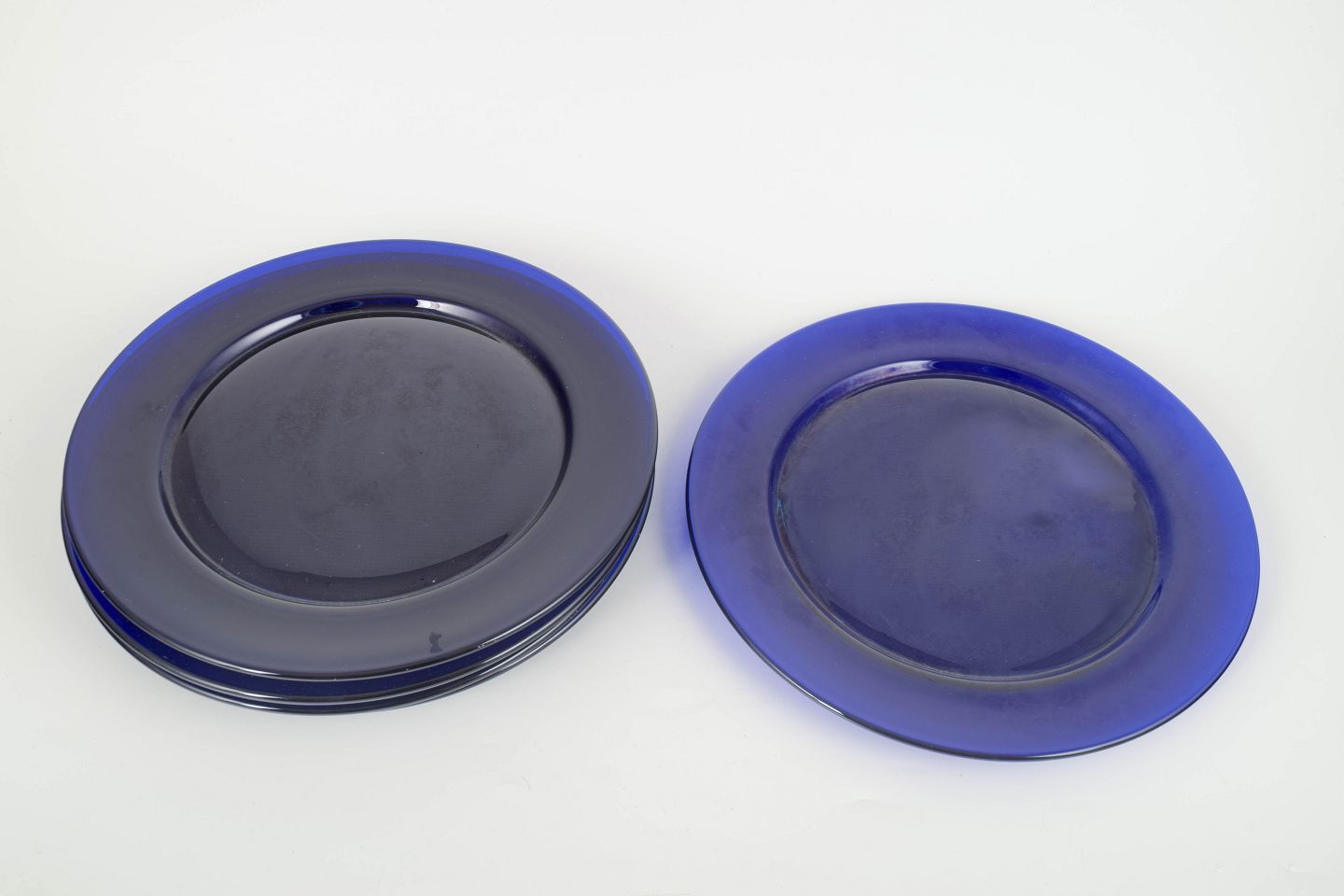 Set of five deep cobalt-blue charger plates in thick, transparent art glass. The clear, saturated blue tone and the simple round shape create an elegant and characteristic expression typical of Scandinavian glass design from the 1980s.