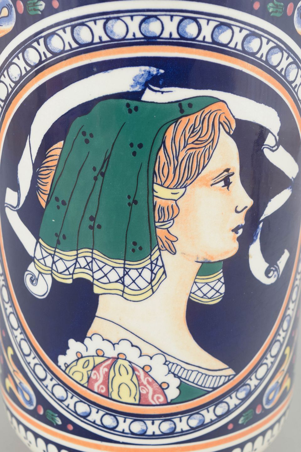 Decorative Italian majolica vase adorned using the decalcomania transfer technique, where the colourful ornamental pattern and portrait medallion are applied as transfer prints in classic majolica style.