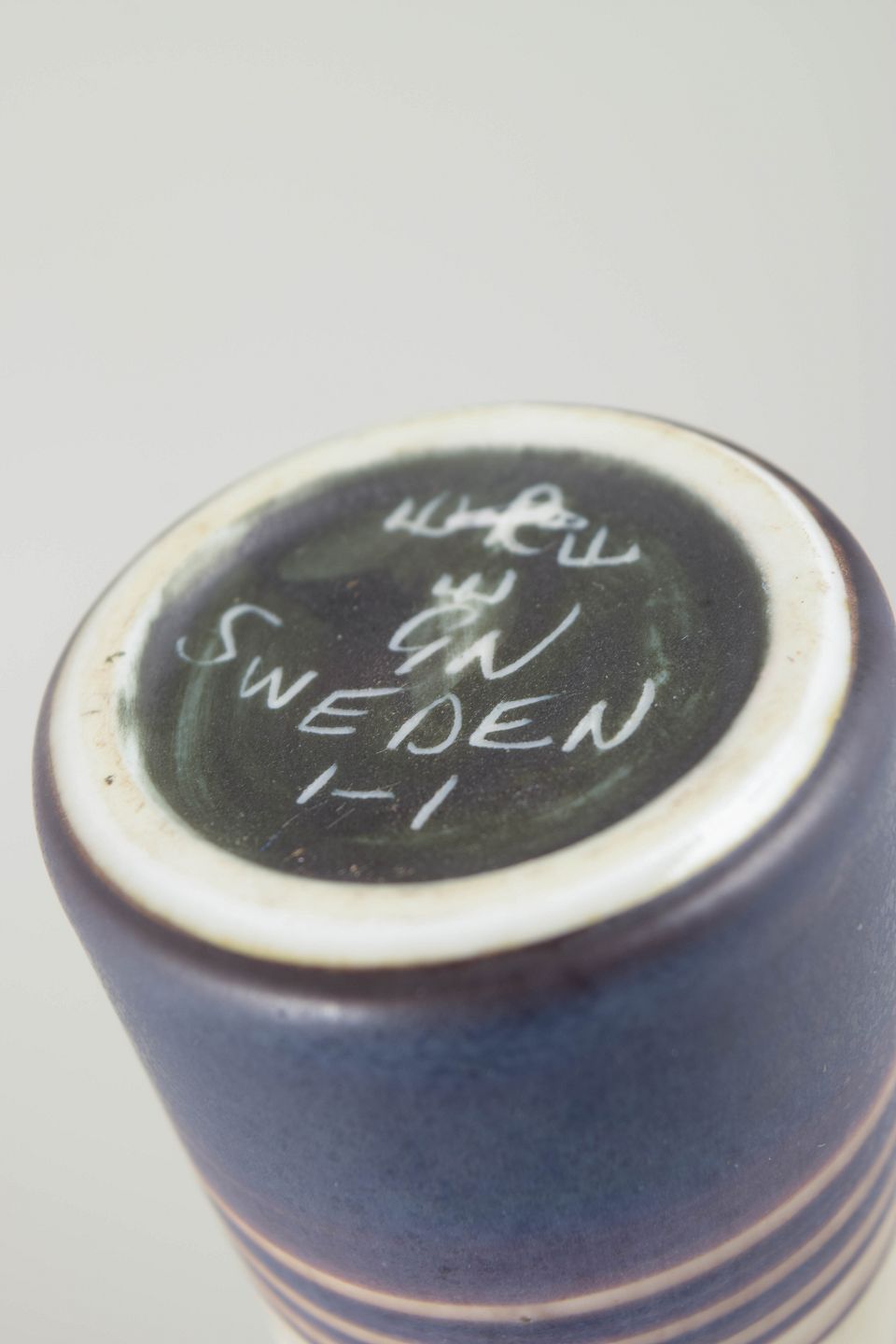 Slim, sculptural stoneware vase with a unique hand-thrown expression, decorated with Nylund’s characteristic stripe pattern in matte blue, brown and white tones. The elegant elongated neck and harmonious colour balance give the piece a refined modernist presence.