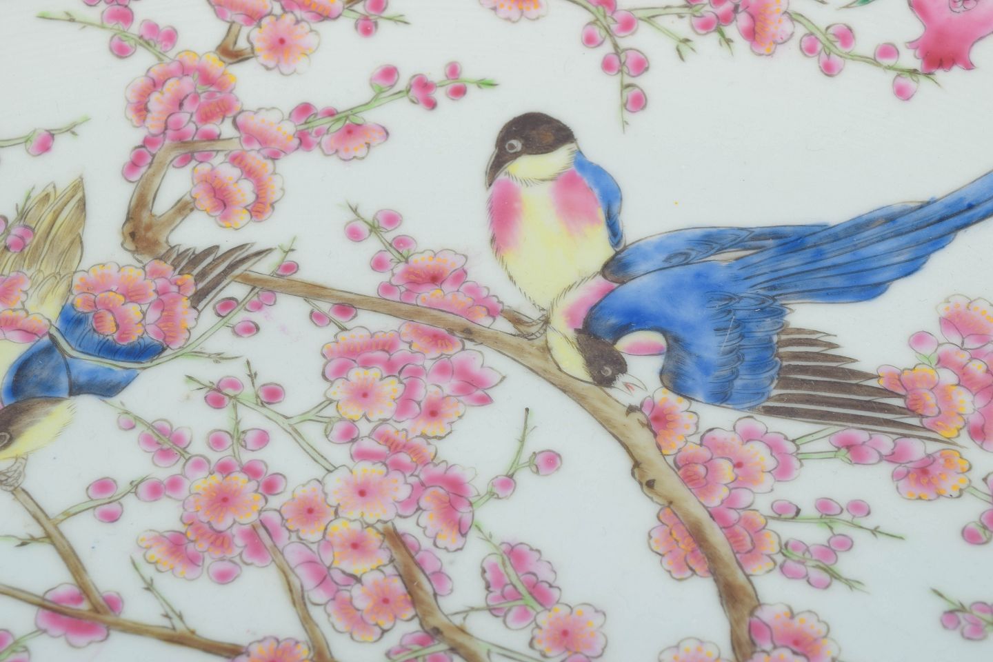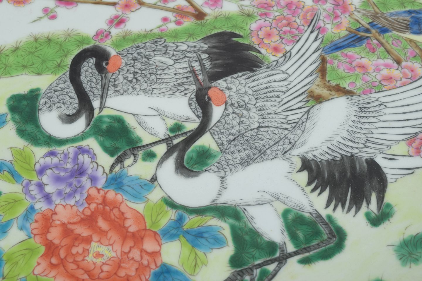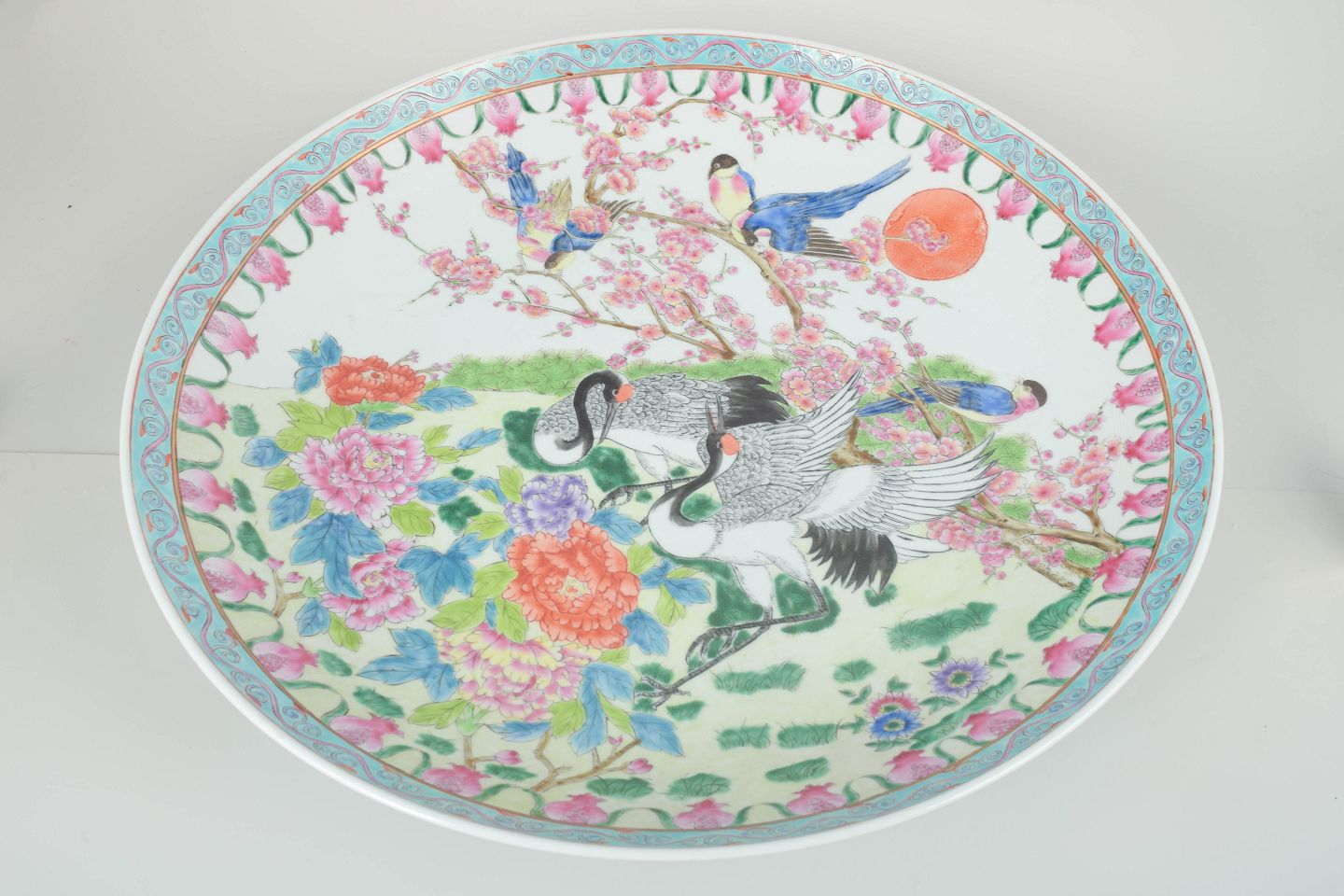 Large, monumental Chinese wall plate in porcelain, richly hand-painted with colourful birds, blossoming trees, cranes, and a sun motif. A decorative and striking piece with strong visual presence.