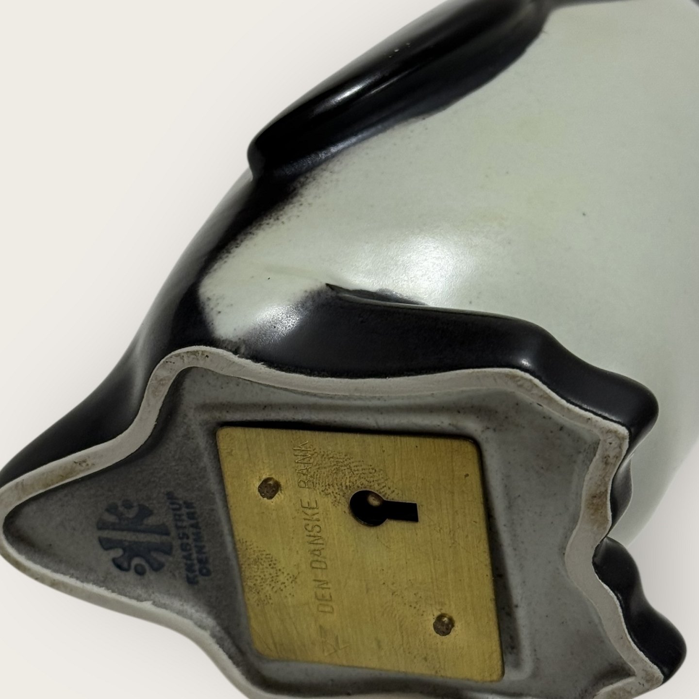Knabstrup ceramics, Penguin money box, Pondus made for Den Danske Bank, 27cm high, good condition but missing key.