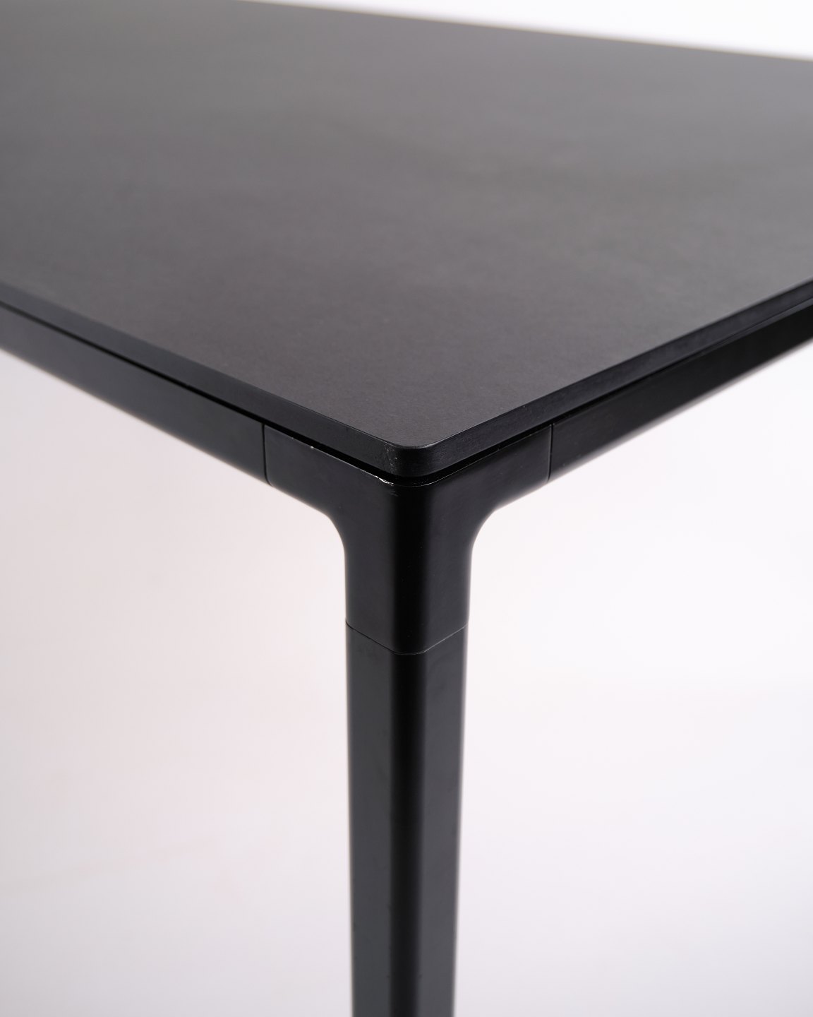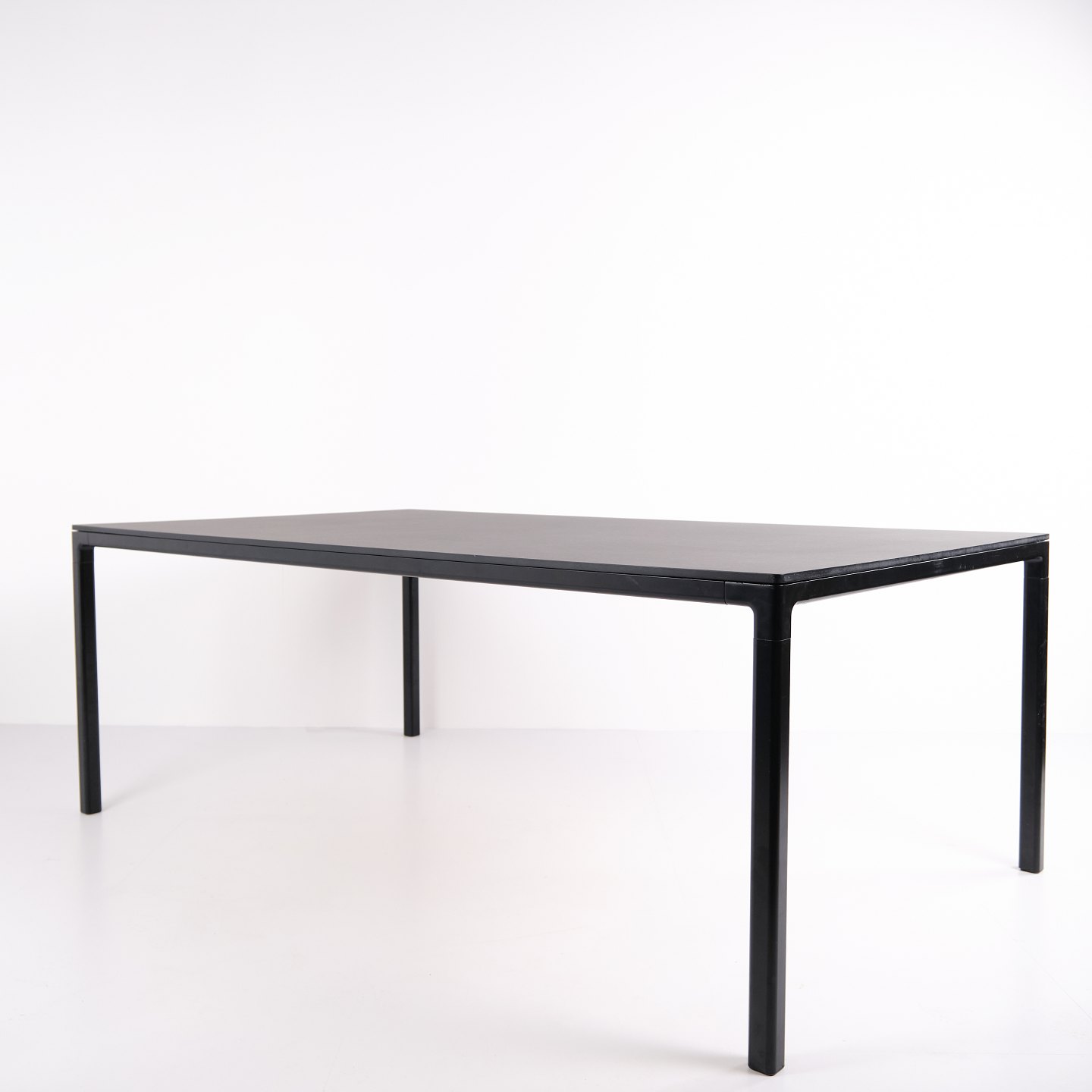 HAY T12 dining table with a black linoleum tabletop and black powder-coated aluminium frame. A clean and spacious table with rounded corners, suitable for both dining and work use.