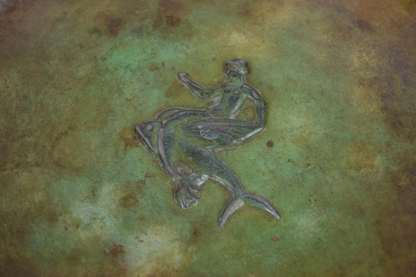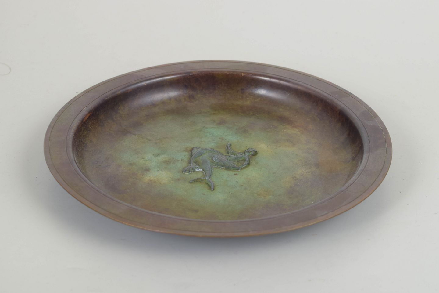 Round art deco bowl in patinated bronze with a central relief figure, executed in Just Andersen’s characteristic LB alloy. The green-brown patina creates a deep, vibrant surface typical of the workshop’s decorative metalwork.