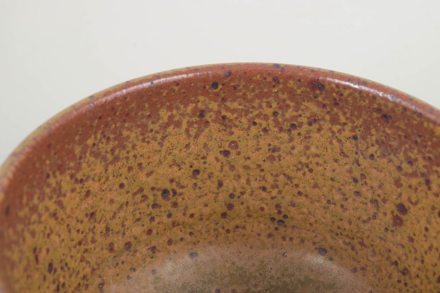 Hand-glazed stoneware bowl in warm brown-yellow tones with a densely speckled surface, characteristic of Starck’s experimental colour and texture work during the period.