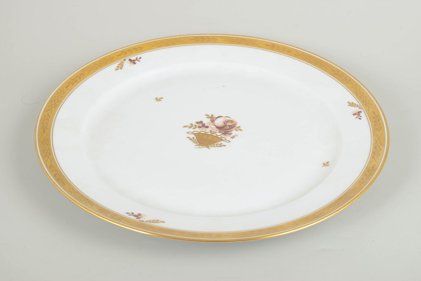 Large and elegant porcelain serving platter from Royal Copenhagen’s “Golden Basket” series, model 595/9047. Features a wide gilded rim and the classic hand-painted floral basket motif at the centre.